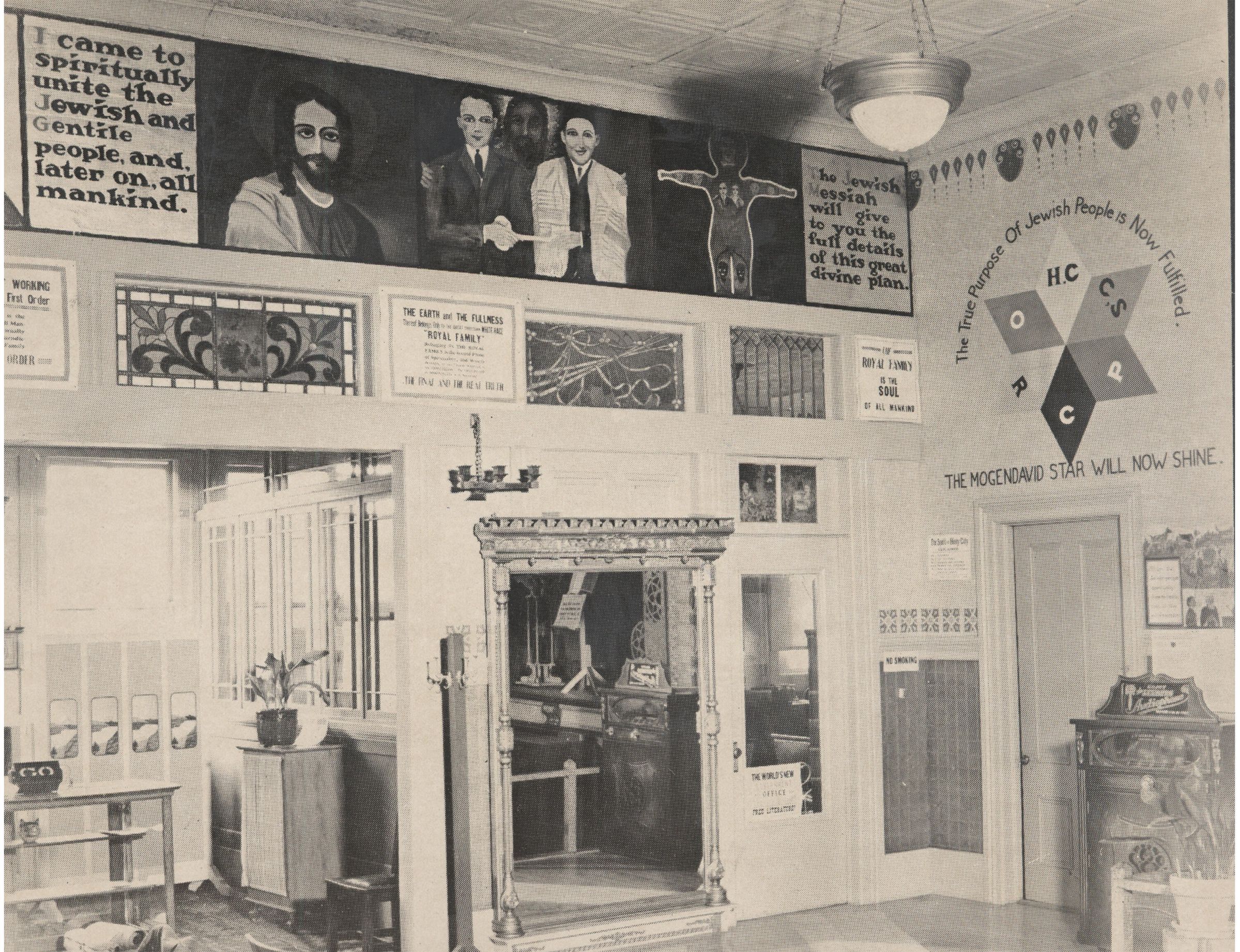 The interior of a building owned by "Father Riker," founder of Holy City, with some of his beliefs depicted on the walls. MTN054Collection