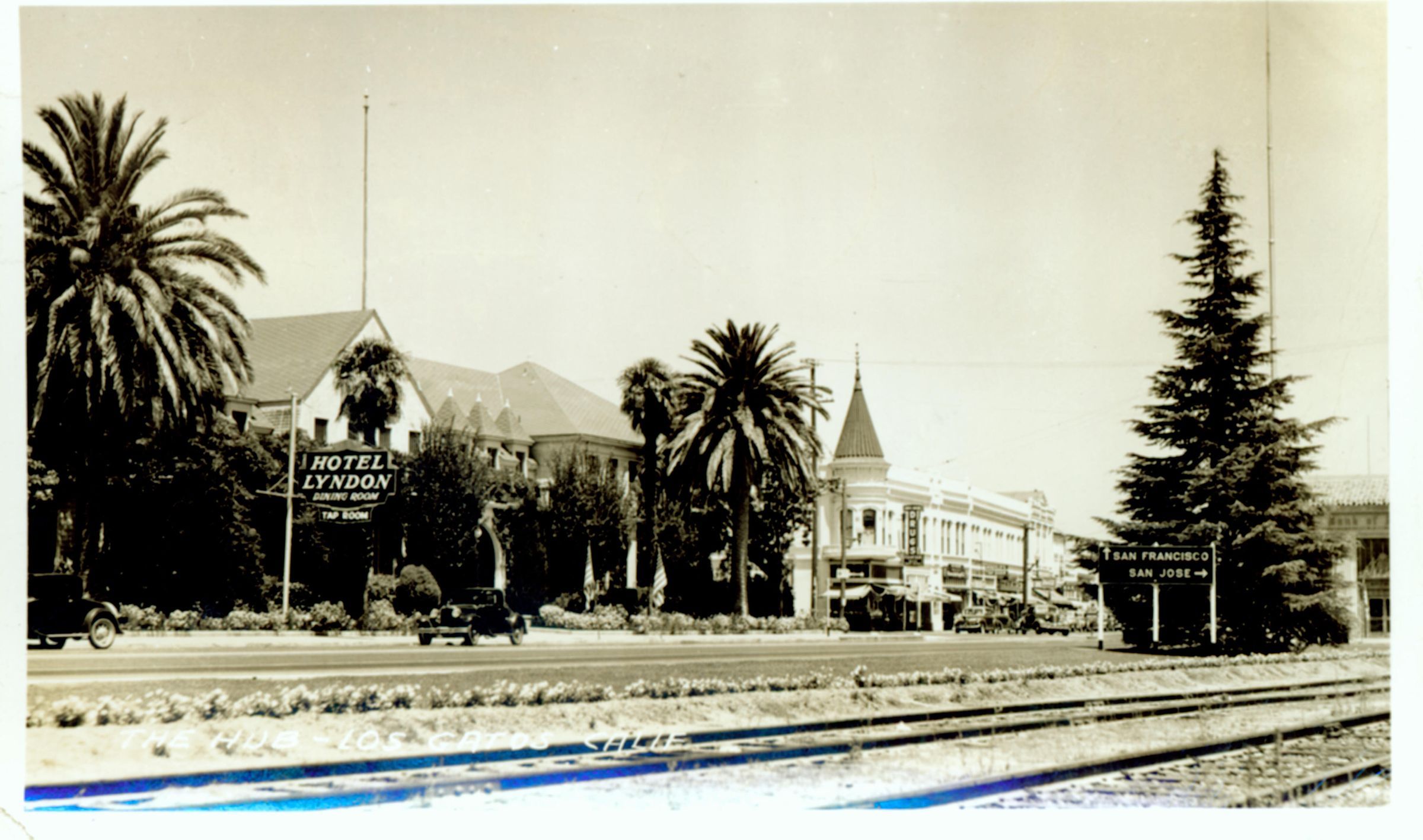 Santa Cruz Avenue looking towards Main Street. Hotel Lyndon and the Corner Drugstore are prominent features in photograph, as well as the Town's Christmas tree, far right, planted by the History Club in 1923. BER187Collection