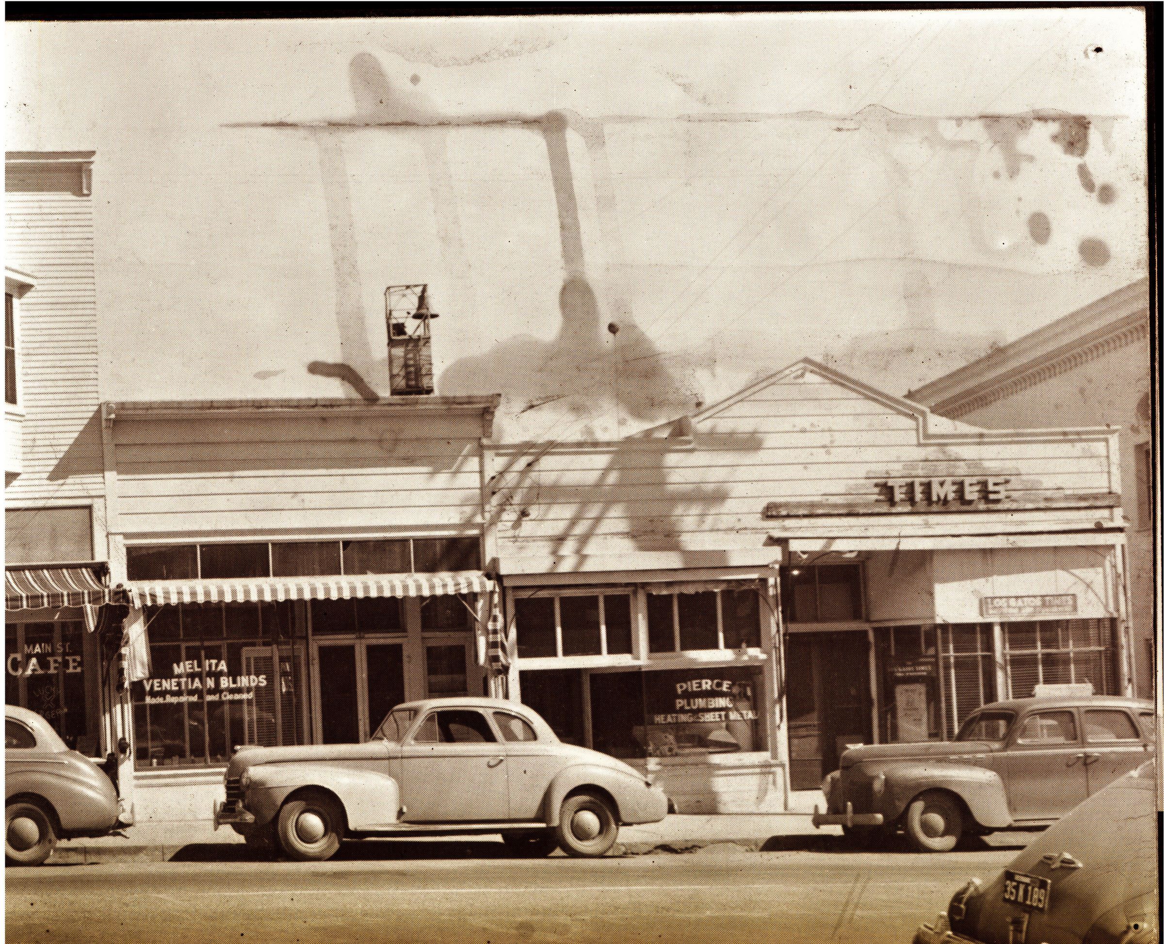 Los Gatos Times building is at the extreme right of this photo at 50 W. Main St., on the corner of what is now Lundy Lane and Main St. Fire bell tower behind St. Luke's Episcopal Church can be seen above the buildings. BDG031Collection