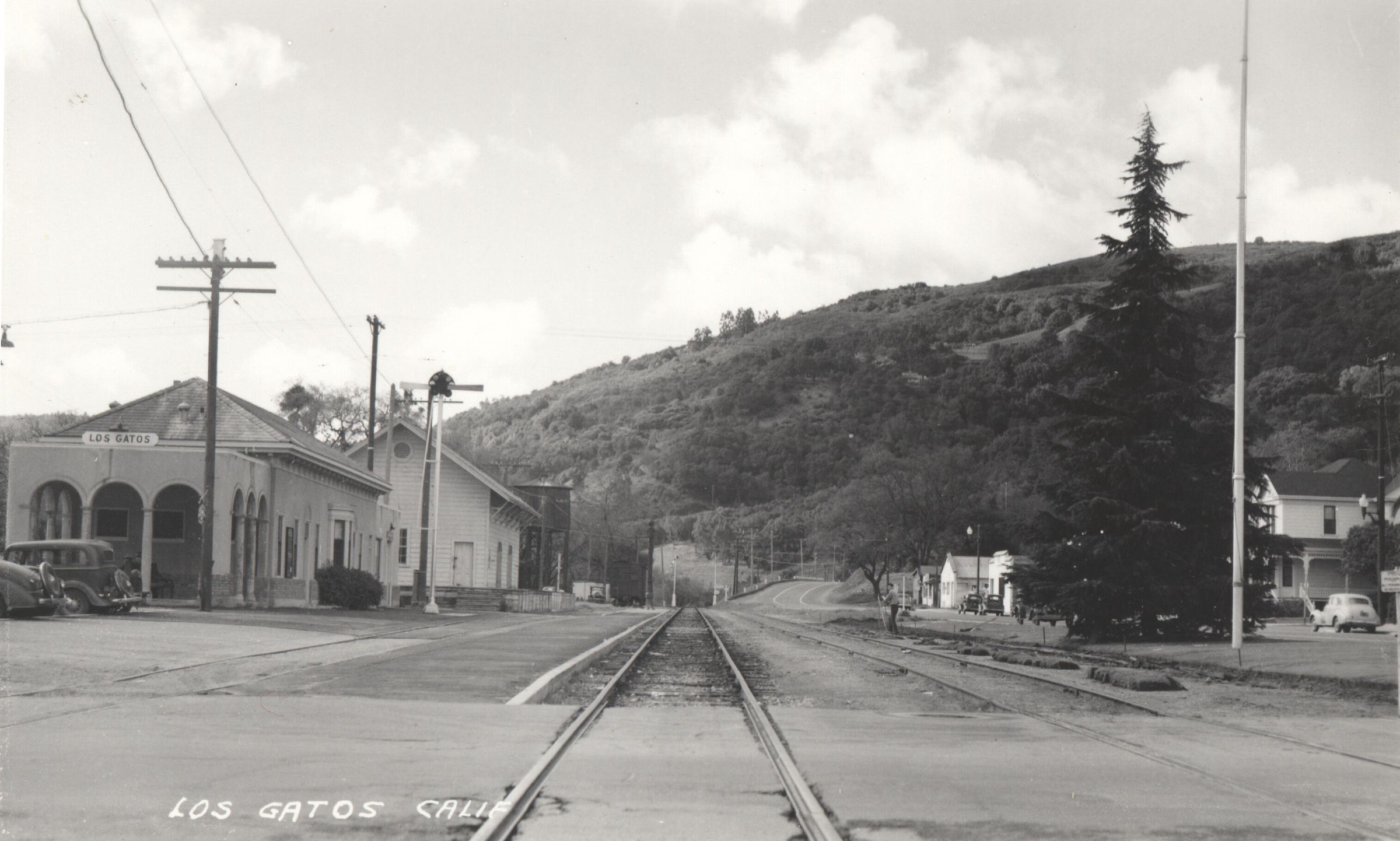 This photograph provides an overview of the depot and vicinity during the final days of Santa Cruz passenger service. Note the water tower, pictured in the background, and the landmark Town Plaza Christmas tree that was planted by the History Club of Los Gatos in 1923. RRS011Collection
