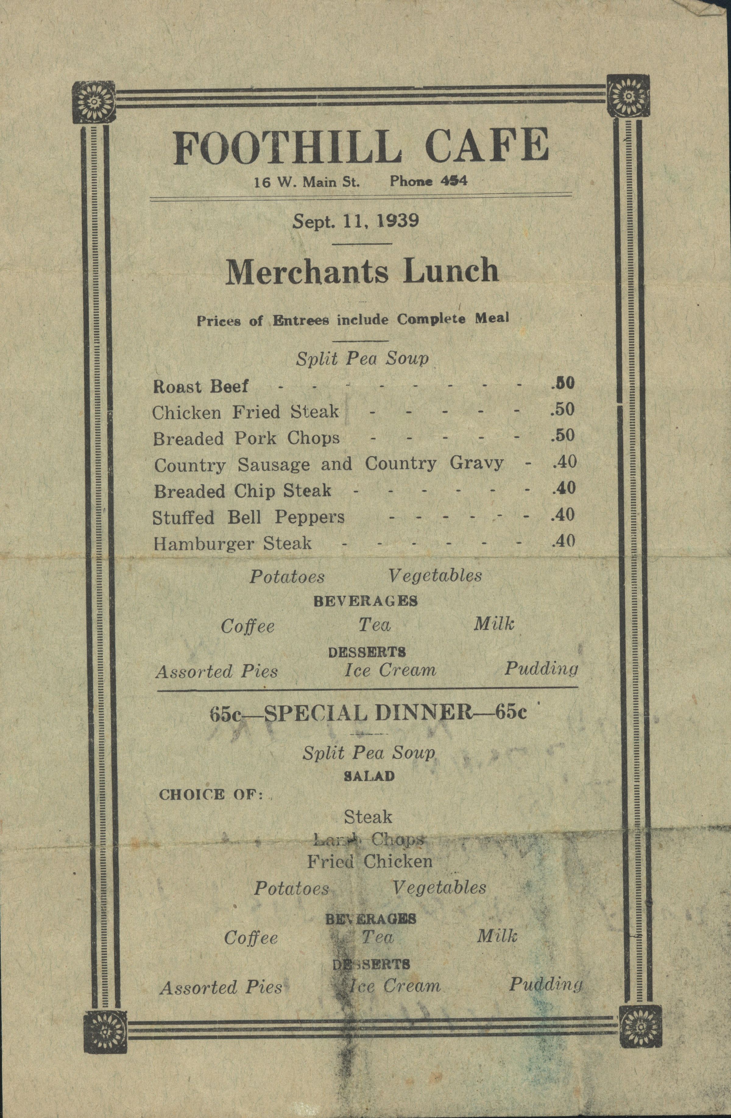 Restaurant was located at 16 West Main St. The most expensive meal, including soup, salad, entree, potatoes, vegetable, beverage and dessert, was 65 cents. BER162Collection