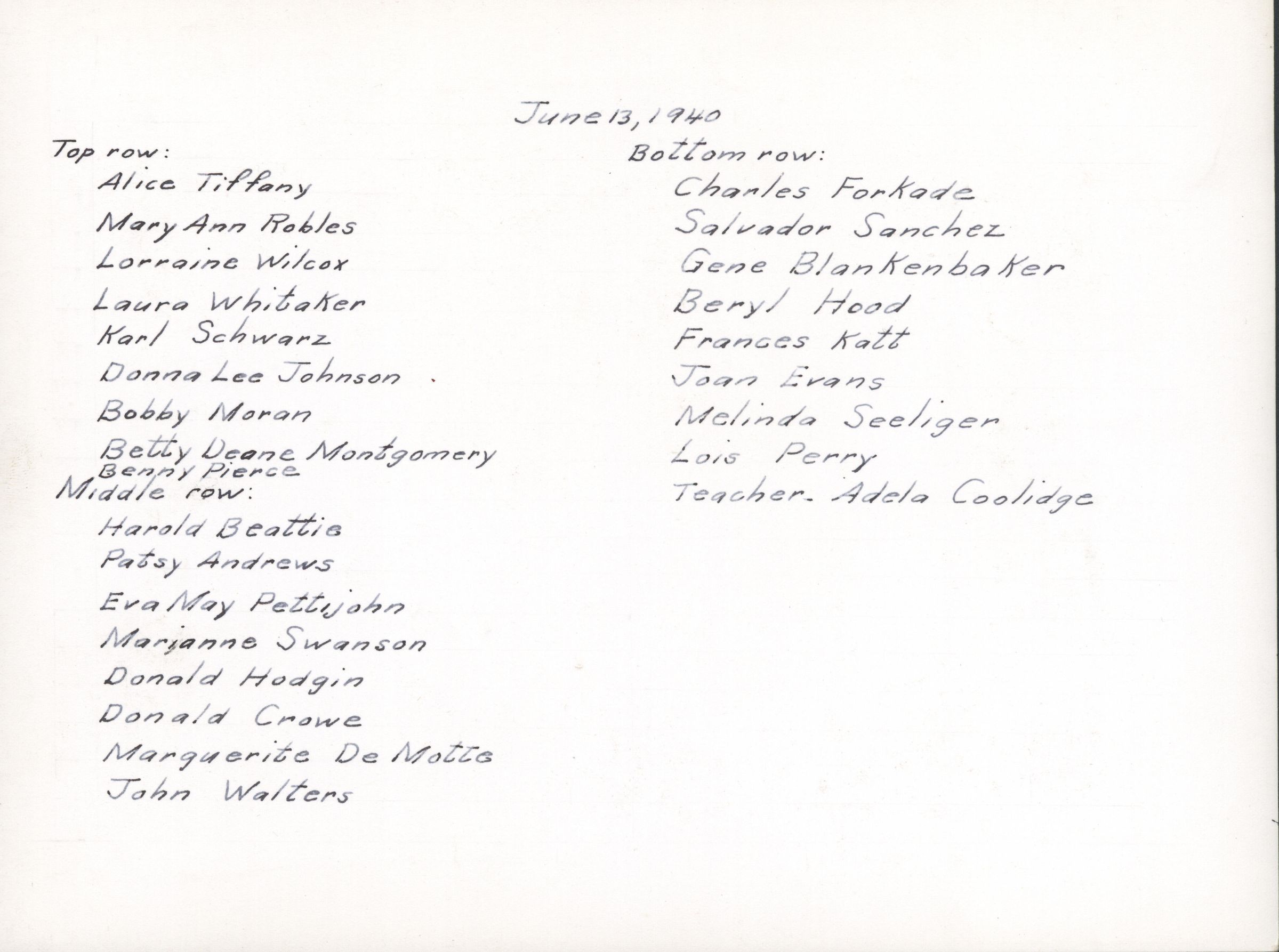 1940 Class 1 - Adela Cooledge, teacher, verso, University Avnue SchoolEntry/Object ID