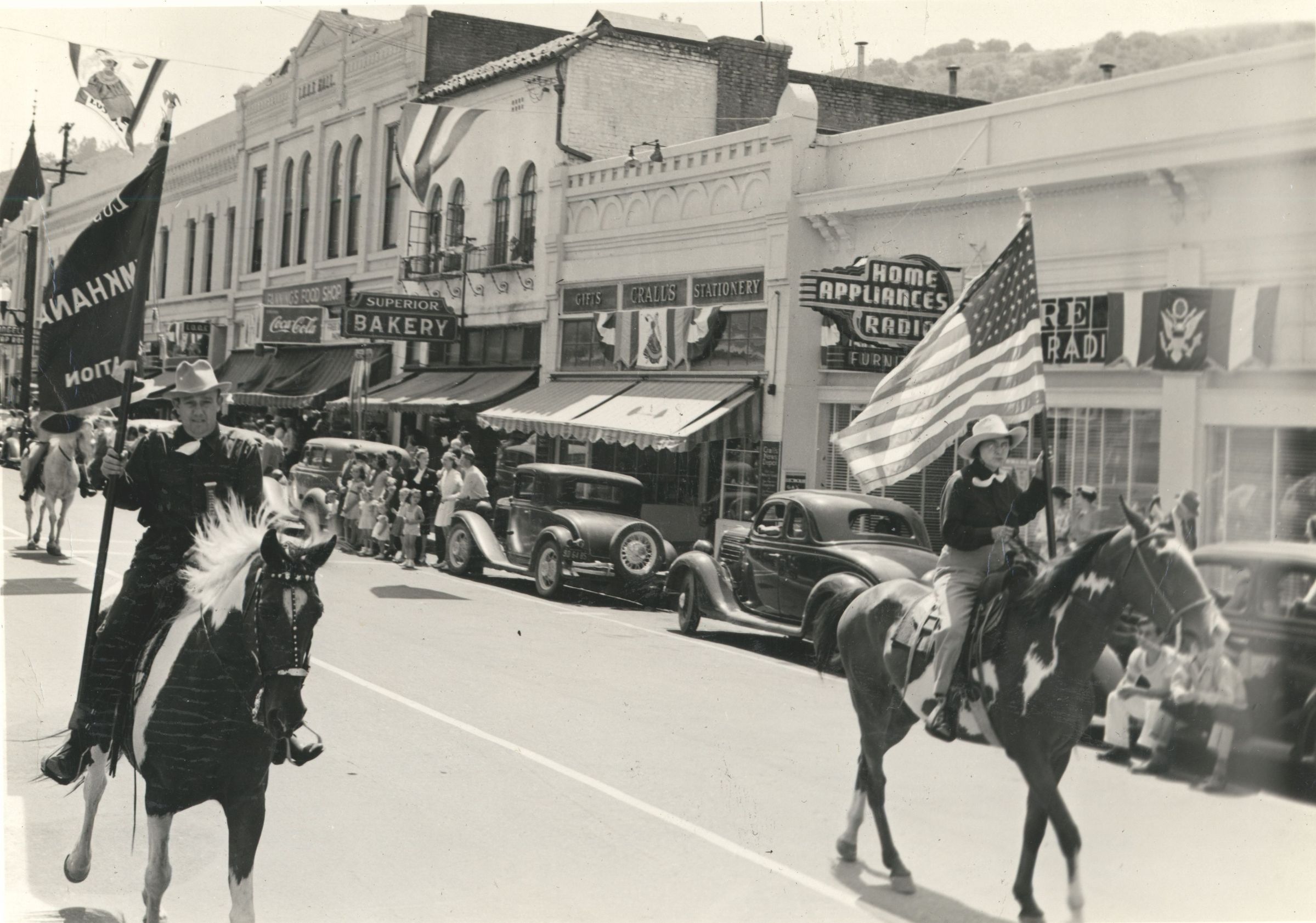 A man and woman on horseback are carrying the U.S. flag and the Gymkhana Association flag, traveling north on Santa Cruz Avenue on August 3, 1940. PARO18Collection