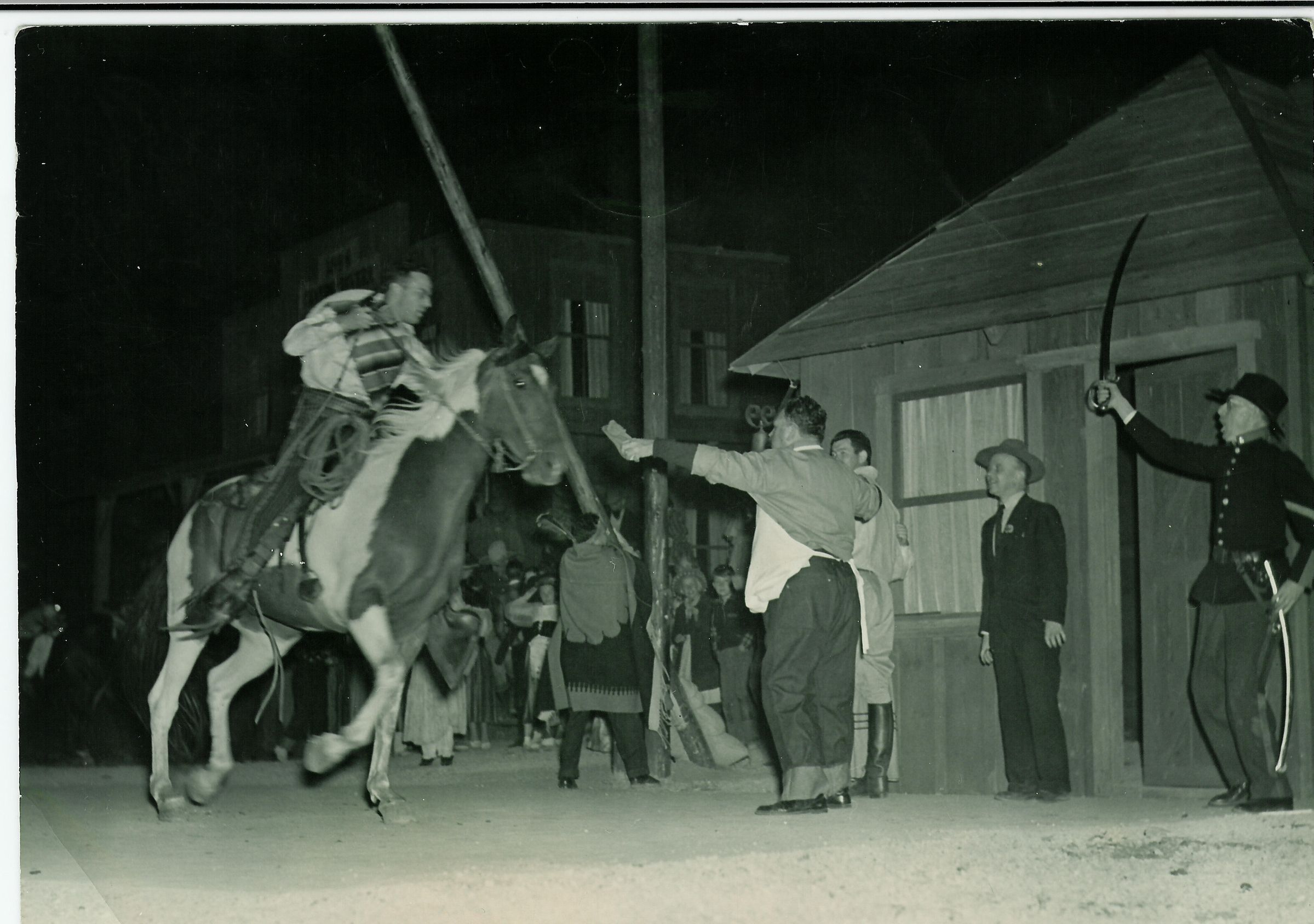 Rolf Conwell, as a bandit, rushing towards tollgate keeper, Prentiss Brown. John Lincoln is brandishing a Civil War sword. He is playing Sergeant Jackson of the California Rifles. The man with the suit and hat is L. B. Peck. PAG073Collection