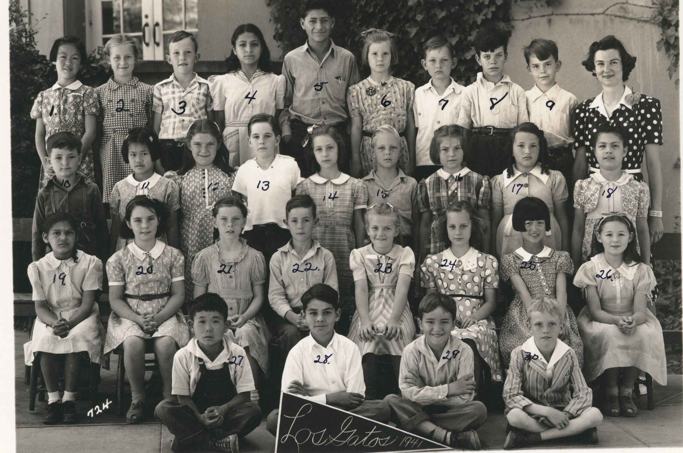 1.Frances Gok 2.Vinnie Lou North 3.Richard Lundy 4.Julliet Telly 5.Rudolph Telly 6.Joyce Thomson 7.Mark Reschar 8.Billy Amato 9.Dickie Daily, Miss Lucille Gruber, teacher, 10.Donny Dalton 11.Nellie Chew 12.Phyllis Graun 13.David Chegwin 14.Shirley Cage 15.George Larimore 16.Bertha Seeliger 17.Pauline Pires 18.Pauline Robles. 19.Elvira Flores 20.Anne Boyce 21.Beverly Elder 22.Joseph Ponciano 23.Donna Mae Wegner 24.Linda Evans 25.Edna Lee 26.Toni Triest. 27.Momoru Hirosi 28.Nick Garcia 29.Eddie Newman 30.Teddy Carper. LGUSD41010aCollection