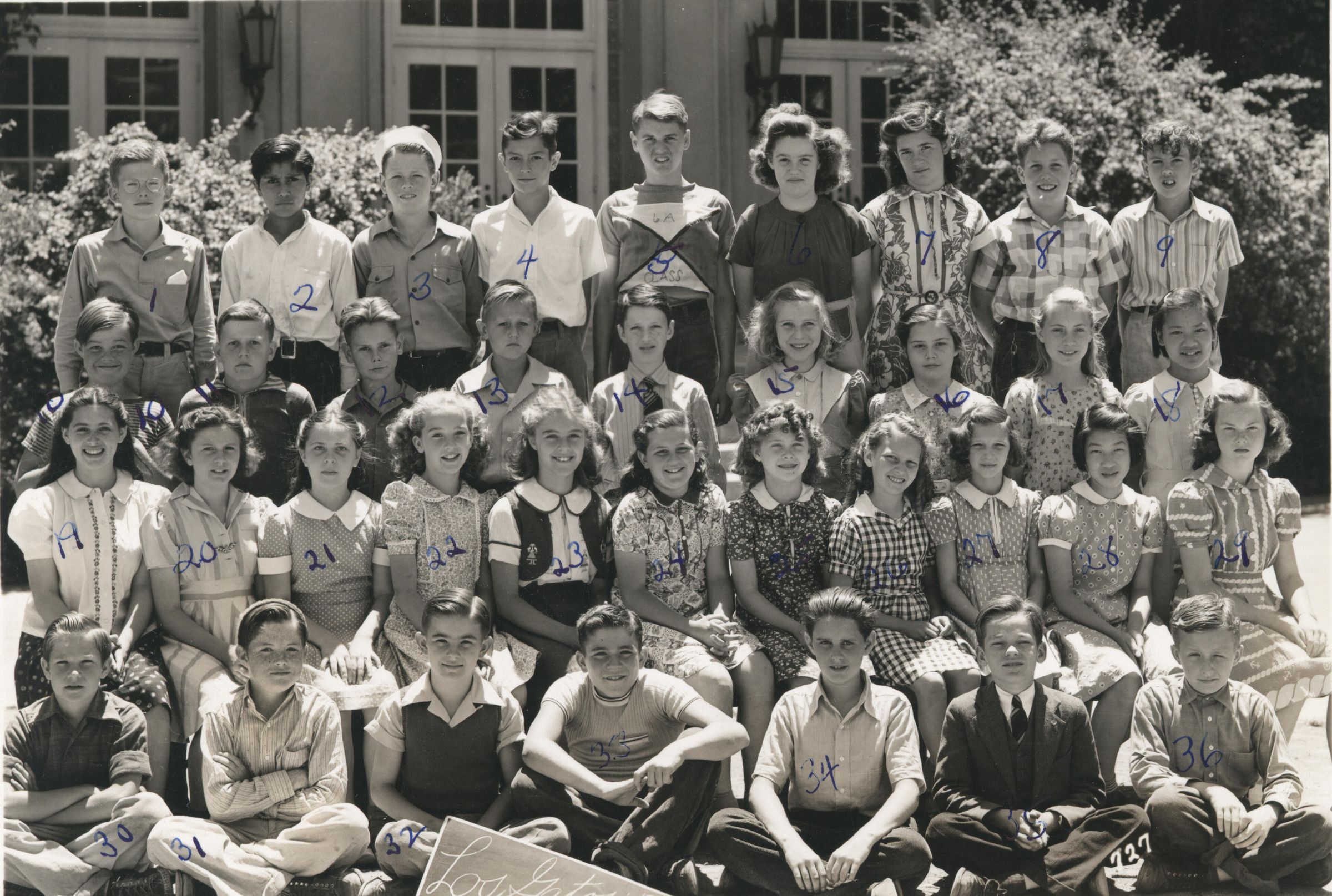 Top row: 1.Martin LeFevre 2.Tom Tobar 3.Jack Panighetti 4.Norman Lapum 5.Ned Lentini 6.Patricia Alford 7.Merle Fullmer 8.Lawrence Groteguth 9.Gerald Bittle. 2nd row: 10.Dale Minden 11.Thomas Sorensen 12.Clyde Montgomery 13.John Reschar 14.John Long 15. Mary Alice Balzer 16.Sally Lueth 17.Viola Goldman 18.Lessie Wong. 3rd row: 19.Georgene Rosenblatt 20.Vonda Landholm 21.Betty Berbieri 22.Peggy Hoyle 23.Angelina Baglas 24.Louise Bortolussi 25.Margaret Hazlewood 26.Thelma Bayles 27.Ruth Reese 28.Lois Woo 29.Dorothy Klindt. Fourth row: 30.Charles Hoyle 31.John MacDonald 32.Robert Frederickson 33.John Hurney 34.Richard Mullen 35.Lorin Heath 36.Ernest Butte. LGUSD41014aCollection