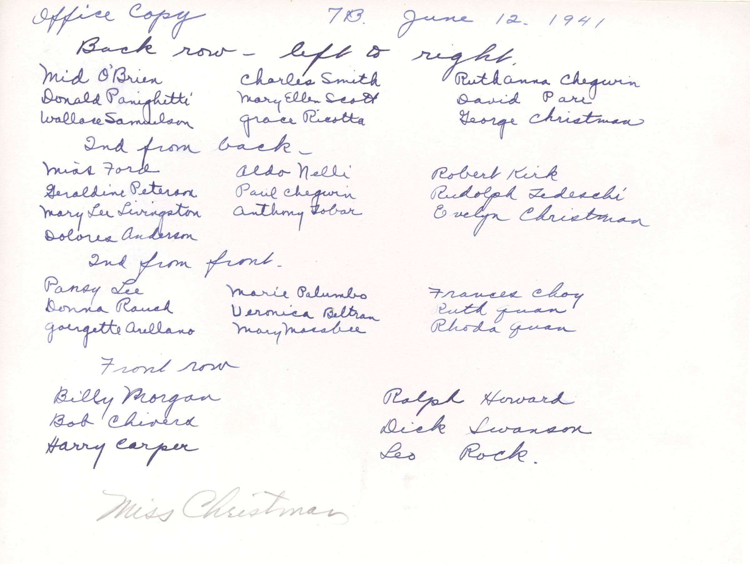 1941 Class 7B - Miss Evelyn Christman, teacher, verso, University Avenue SchoolEntry/Object ID