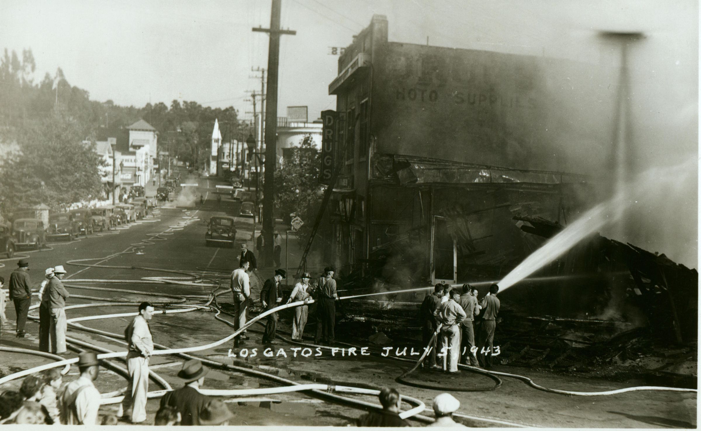 The fourth of July, 1943, was quiet in Los Gatos, during war time. But the next morning brought the biggest conflagration the town had seen since the great fire of 1901. Two buildings were leveled, including the original Palmer Perkins Stoves and Tinware building, which had escaped the 1891 fire, but burned to the ground in 1943. DIS027Subject