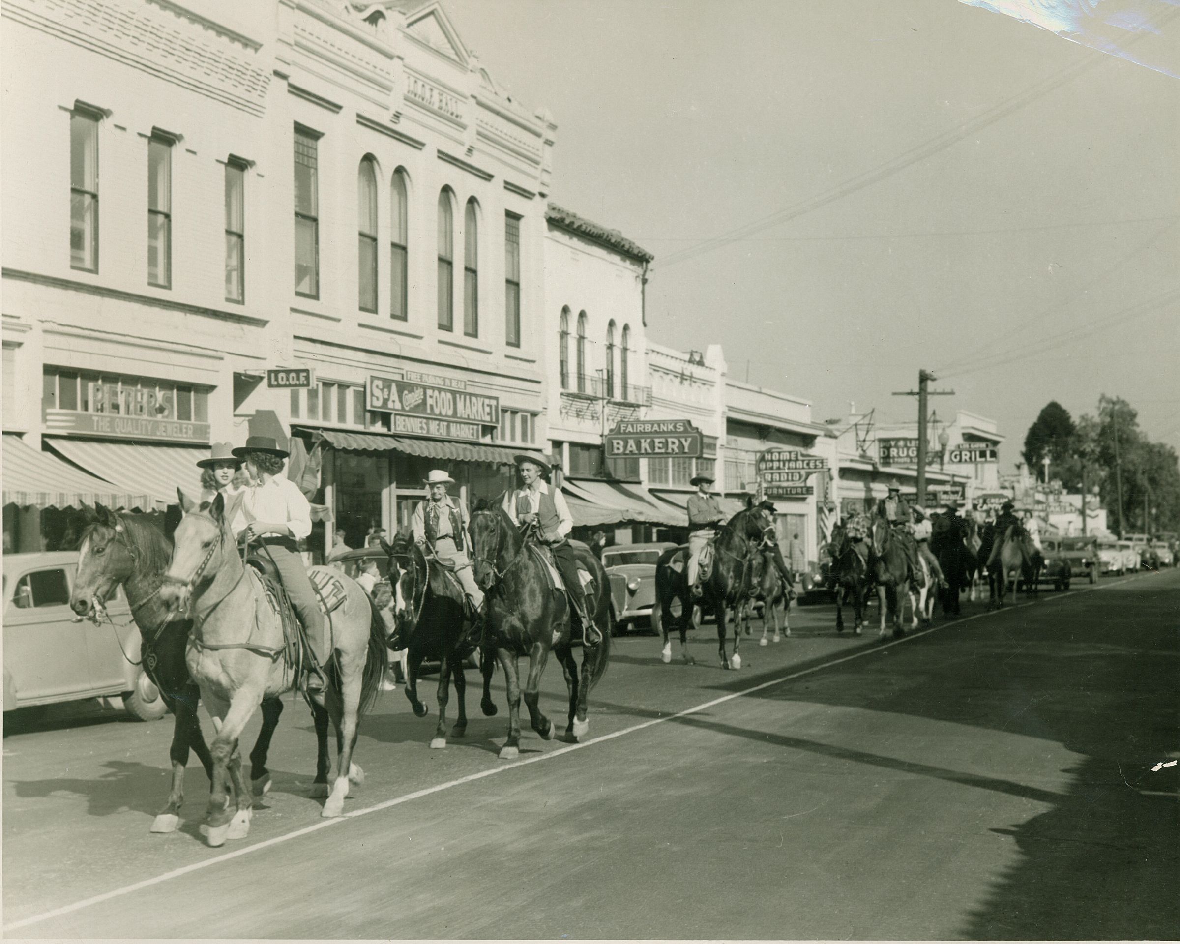 As early as 1935, enthusiastic Los Gatos horse owners banded together for the enjoyment of their sport. On November 8, 1940, 23 local people met at town hall and organized the Los Gatos Gymkhana Association. Future Police Chief Ralph Phillips was elected president; Carl Hubbell, secretary; and Stanley Hopper, treasurer. On Memorial Day, 1941, a formal dedication was held for the new Gymkhana Grounds, which were located in the bottom lands below University Avenue, along the creek. Bleachers, a quarter-mile track and a ring for showing horses were available. This photograph, circa 1946, shows a parade on Santa Cruz Avenue. Los Gatos parades in this era featured up to 200 horses. Gymkhana ended with the coming of the freeway in the mid-1950s. BA127Collection
