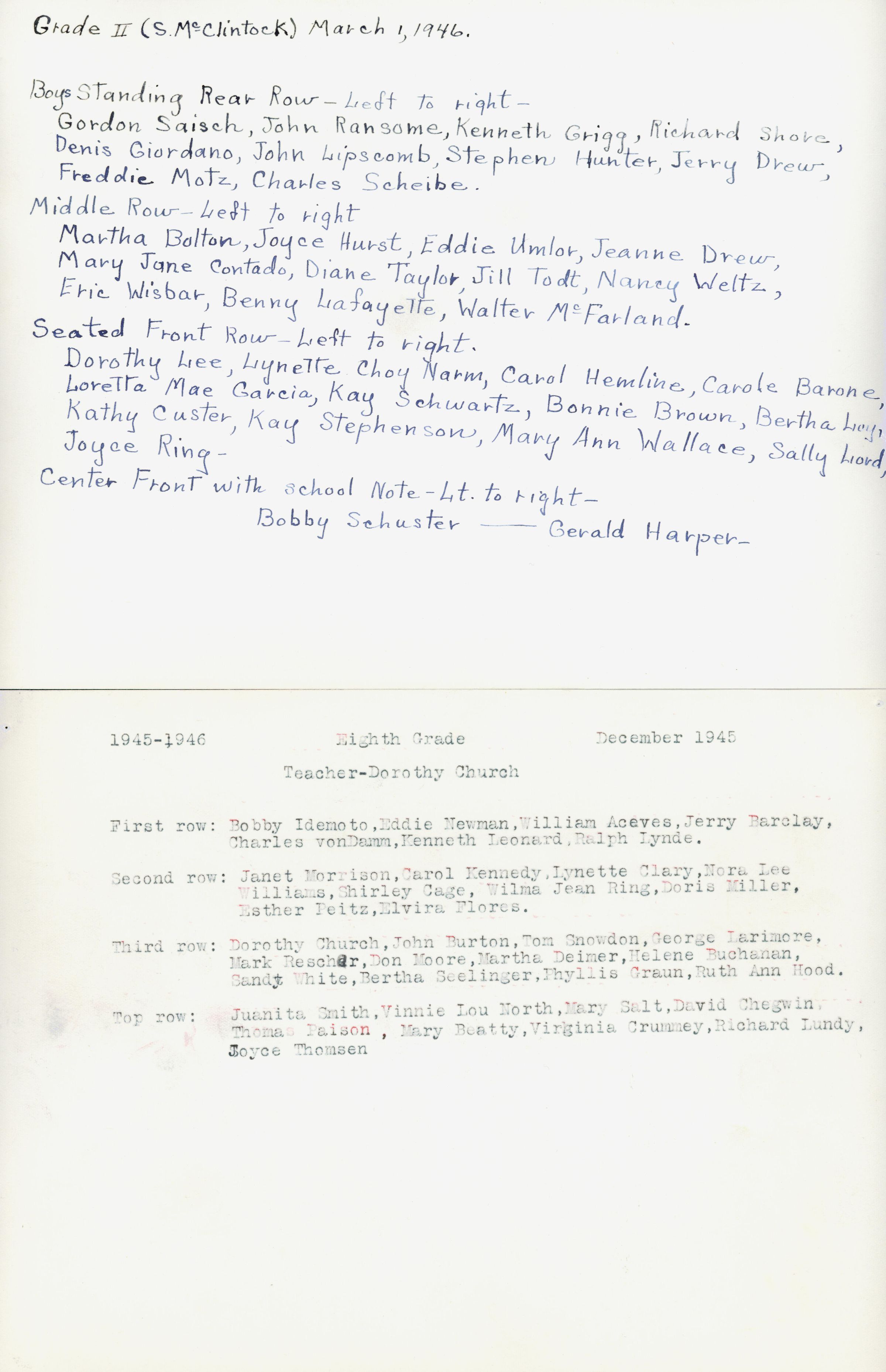 1946 Class 2 - S. McClintock, teacher, verso, University Avenue SchoolEntry/Object ID