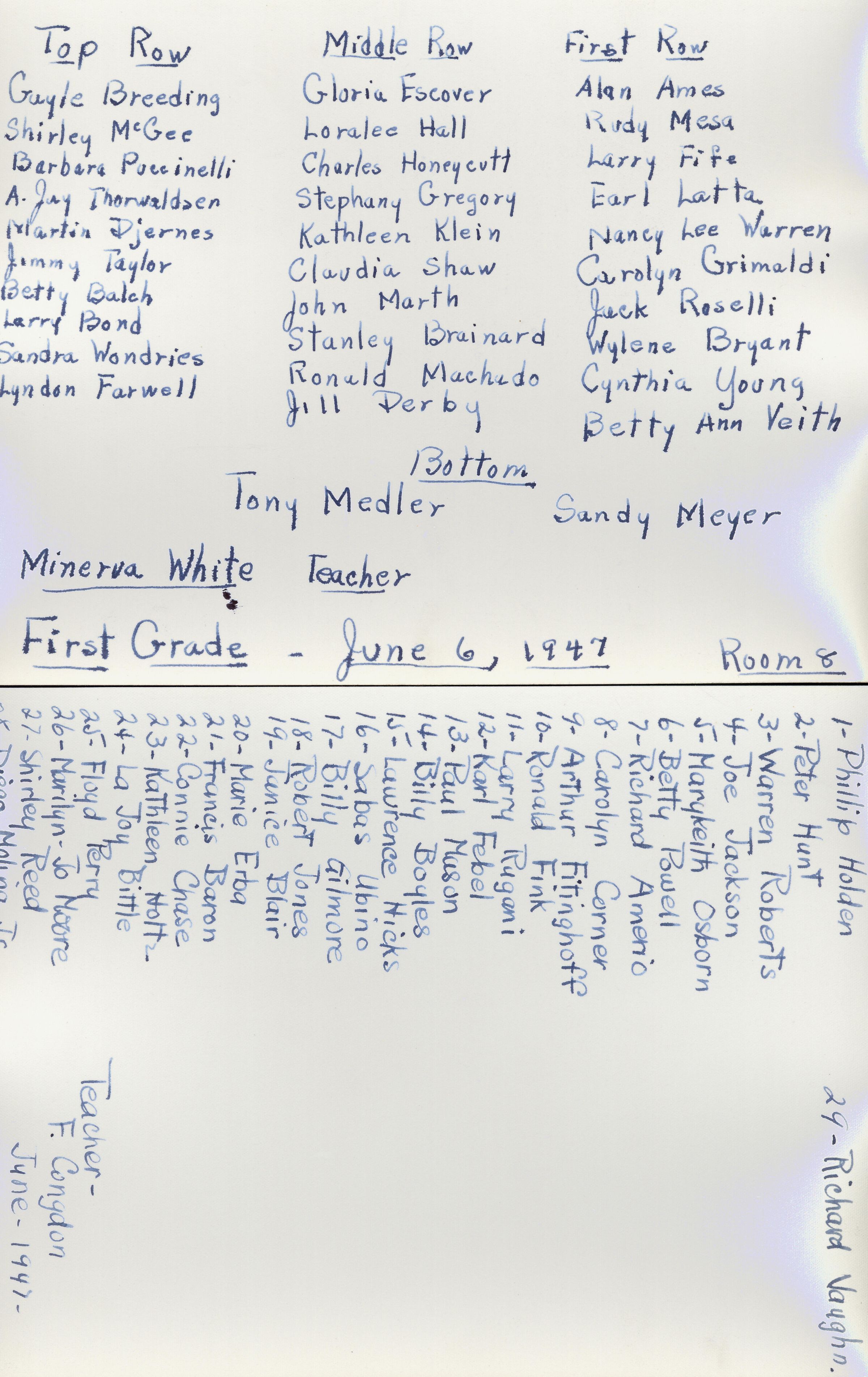 1947 Class unidentified - F. Congden, teacher, verso, University Avenue SchoolEntry/Object ID
