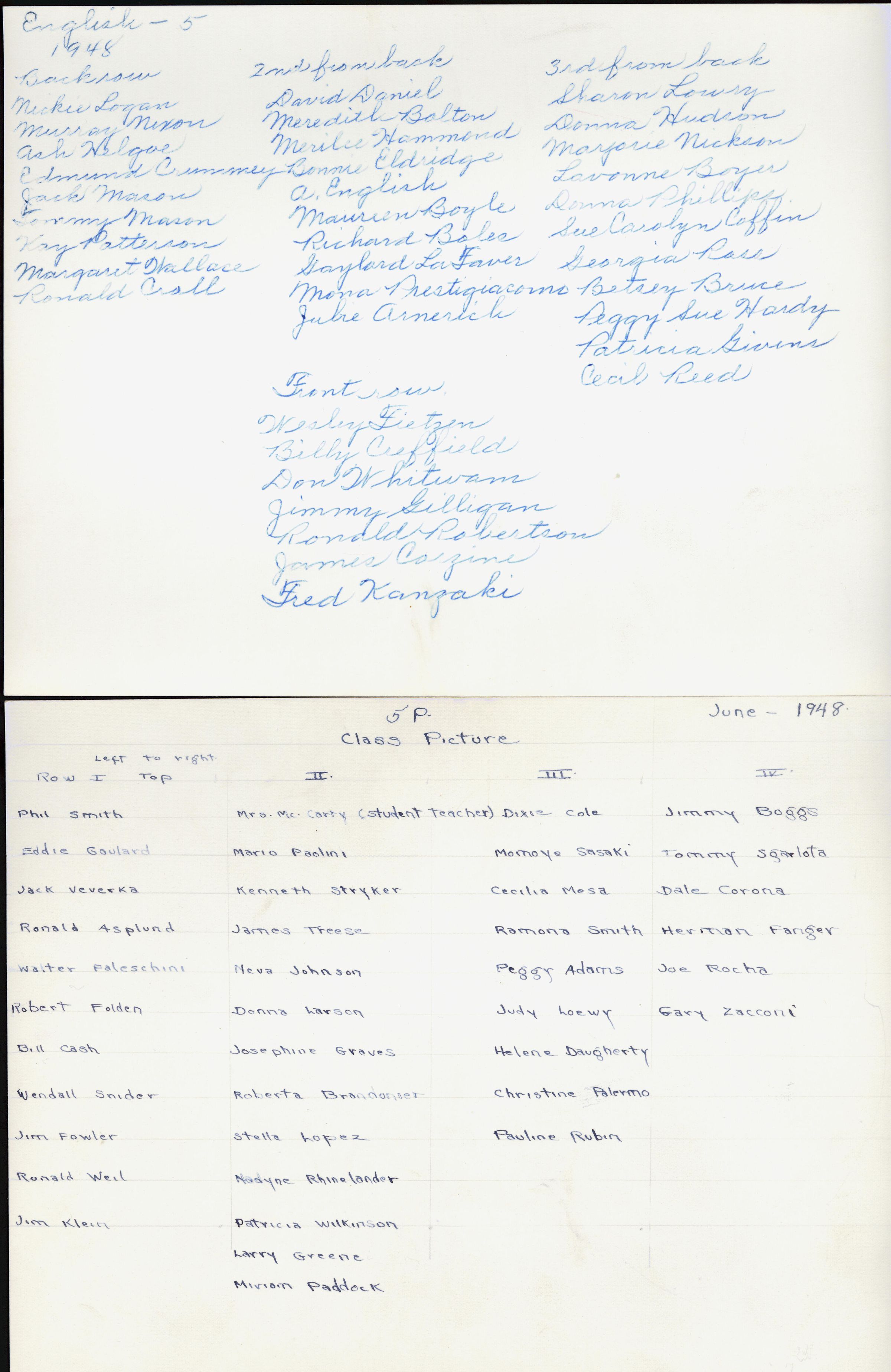 1948 Class 5 - Mrs. Annabel English, teacher, verso, University Avenue SchoolEntry/Object ID