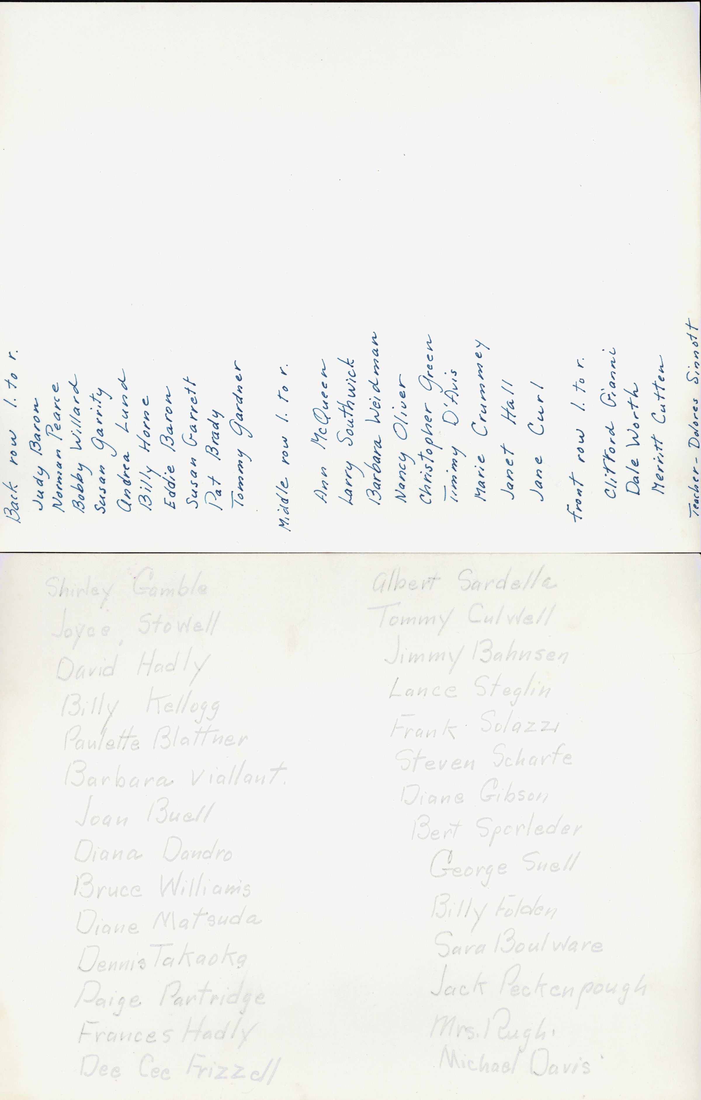 1950 Class unidentified - Dolores Sinnott, teacher, verso, University Avenue SchoolEntry/Object ID
