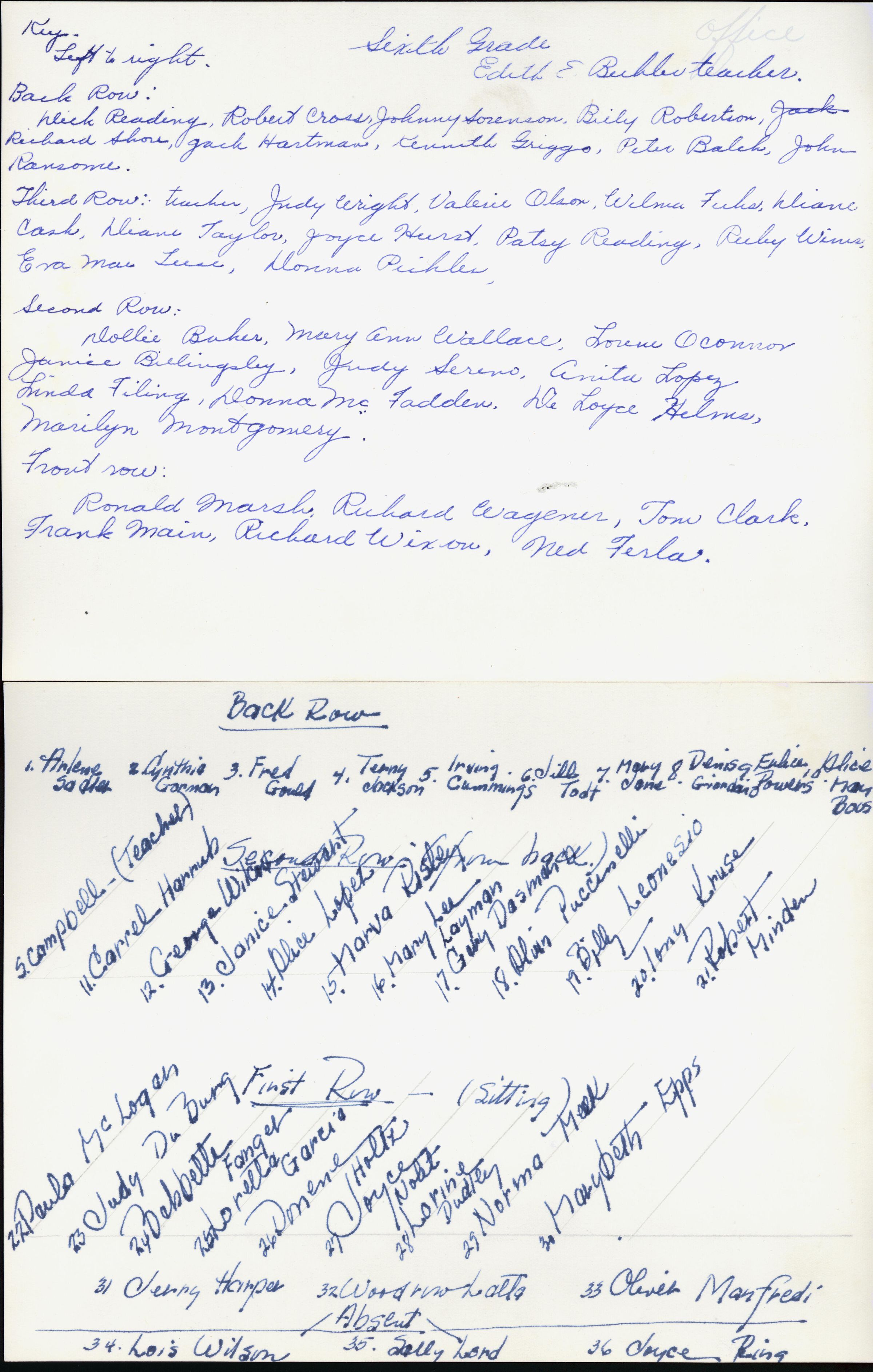 Top row:1. Arlene Sadler 2. Cynthia Gorman 3. Fred Gould 4. Terry Jackson 5. Irving Cummings 6. Jill Todt 7. Mary Jans 8. Denis Girodano 9. Eulice Powers 10. Alice May Boos. 2nd row: S. Campbell, teacher 11. Carrel Harrub 12. George Wilcox 13. Janice Stewart 14. Alice Lopez 15. Marva Risley 16. Mary Lee Layman 17. Gary Dasman 18. Alain Puccinelli 19. Billy Leonesio 20. Tony Kruse 21. Robert Minden. 1st row: 22. Paula McLogan 23. Judy Du Burg 24. Babette Fanger 25. Loretta Garcia 26. Donene Holtz 27. Joyce Nobt 28. Lorine Dudley 29. Norma Meek 30. Marybeth Epps 31. Jerry Harper 32. Woodrow Latta 33. Oliver Manfredi. Absent: Lois Wilson, Sally Lord, Joyce Ring. LGUSD50010bCollection
