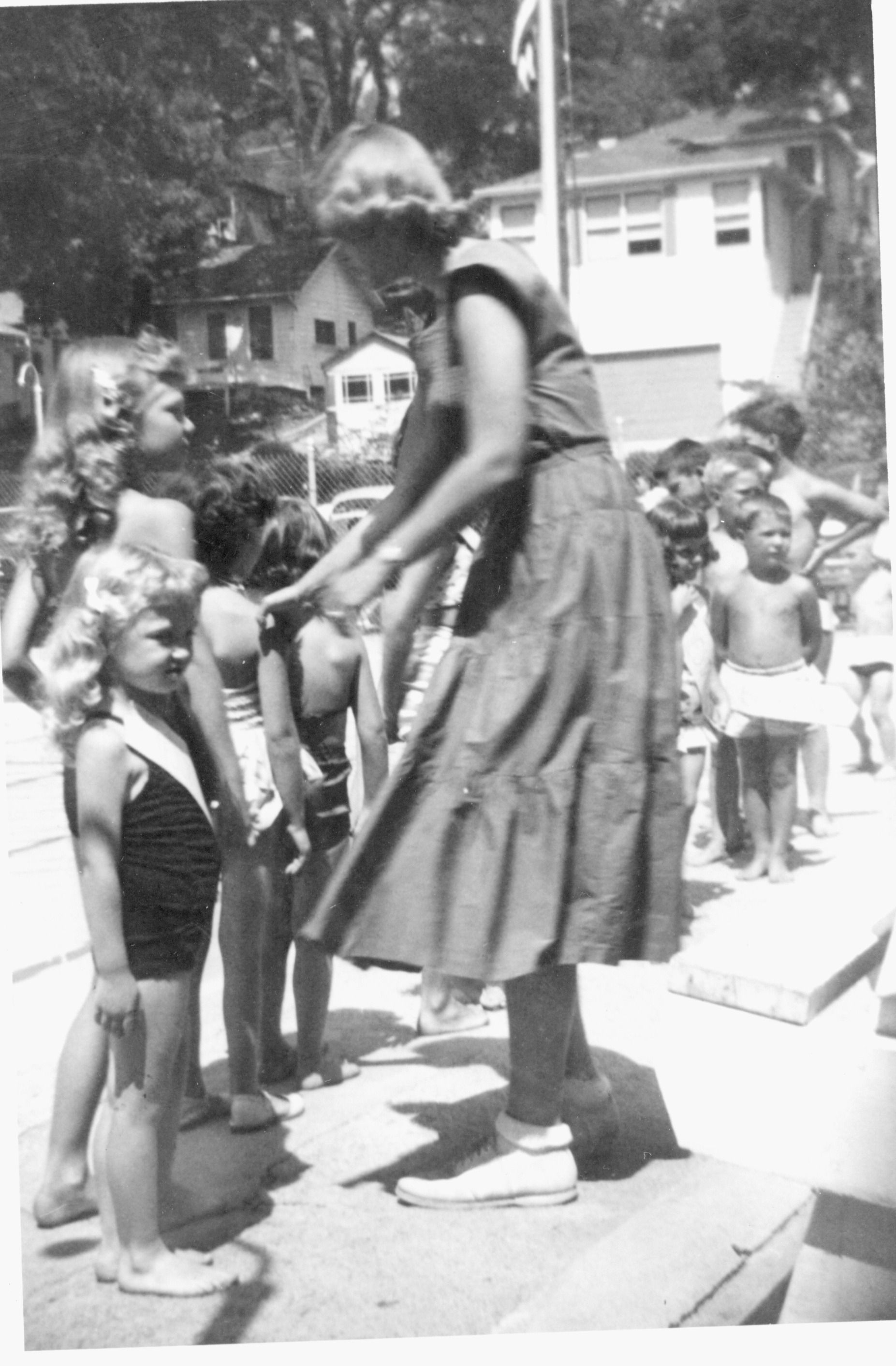 There were four judges at the 1950 "beauty contest" at the Los Gatos pool: Mrs. Donald Johnson, Stanley Sanders, Dick Morris, and Bob Major. Here one of the mothers lines up the children, including little Marlene Caperton, who was named queen. CAP006Collection