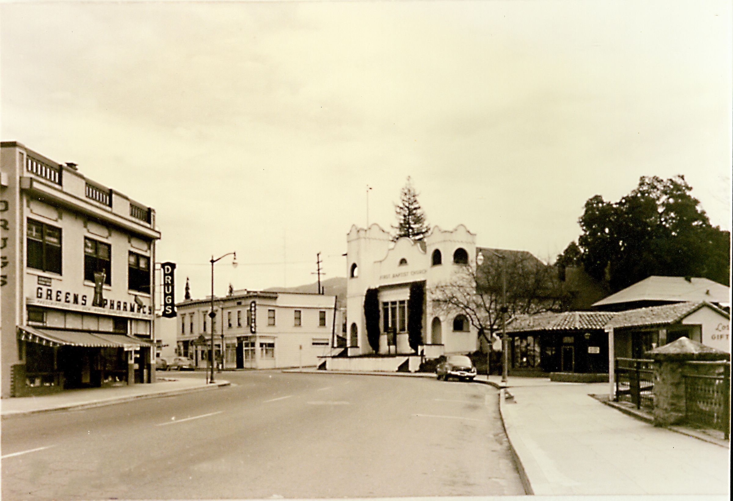 This view of East Main Street looking east shows Green's Pharmacy at left, founded by George A. Green and set up at this location in 1910. The Baptist Church at right sits on land now occupied by the "Cats" penthouse. CAP021Collection