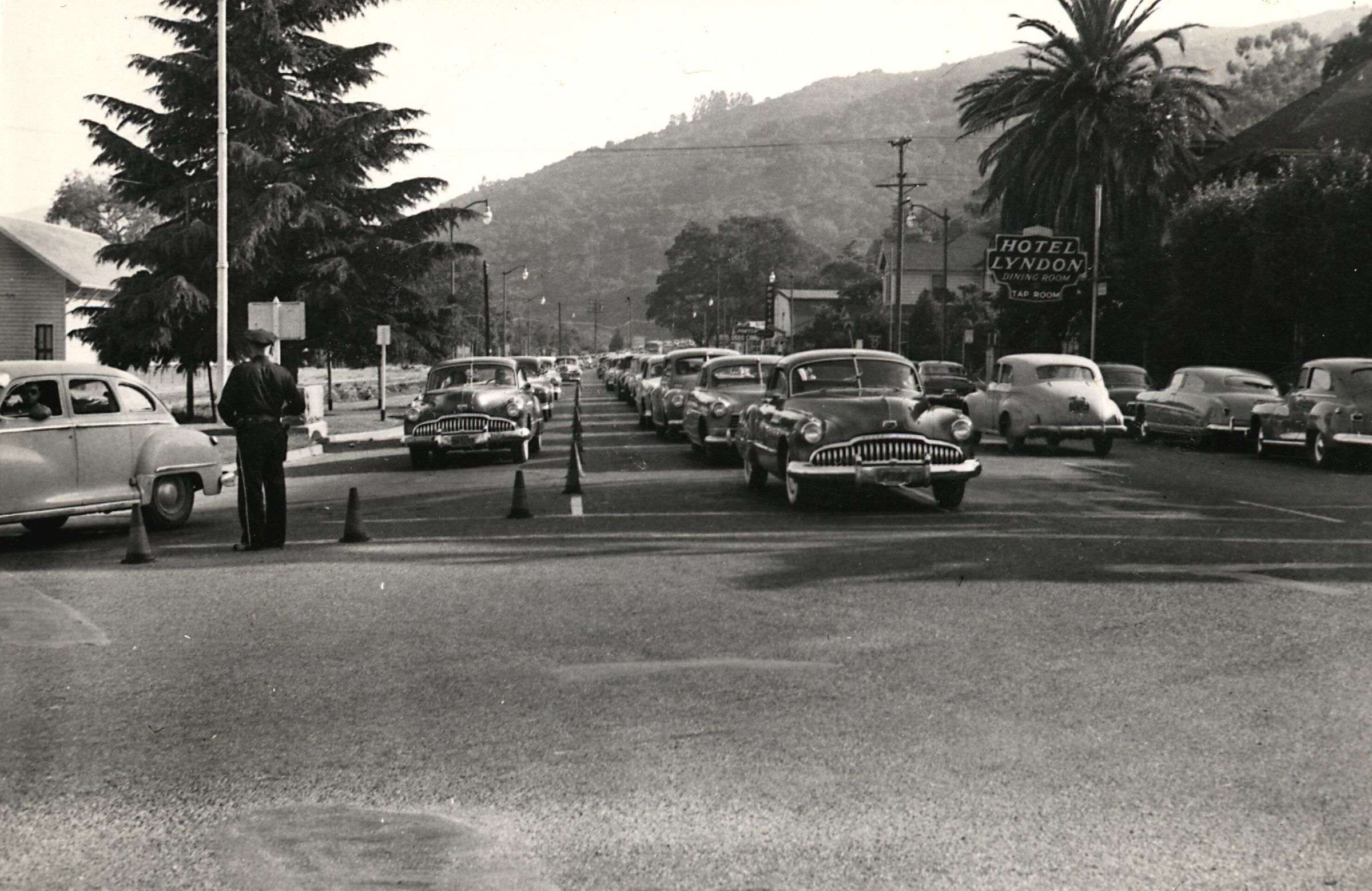 Traffic coming north from Santa Cruz stopped at the intersection of Santa Cruz Ave and Main St. Railroad depot is to the left and Lyndon Hotel on the right. SS015Collection