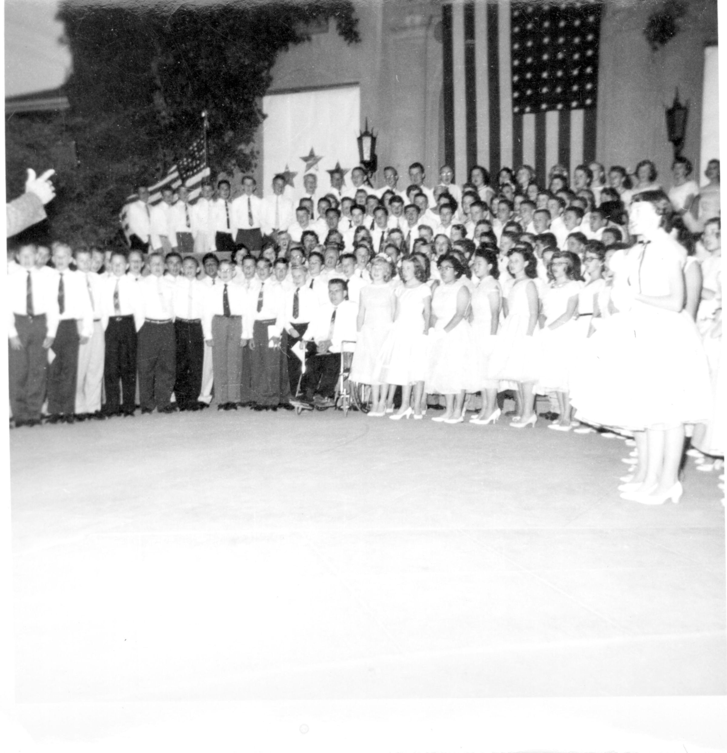 The ceremonies surrounding University Avenue School's 8th grade graduation in 1955 are shown. David Baumgartner is in the wheel chair at the center of the chorus. CAP017Collection