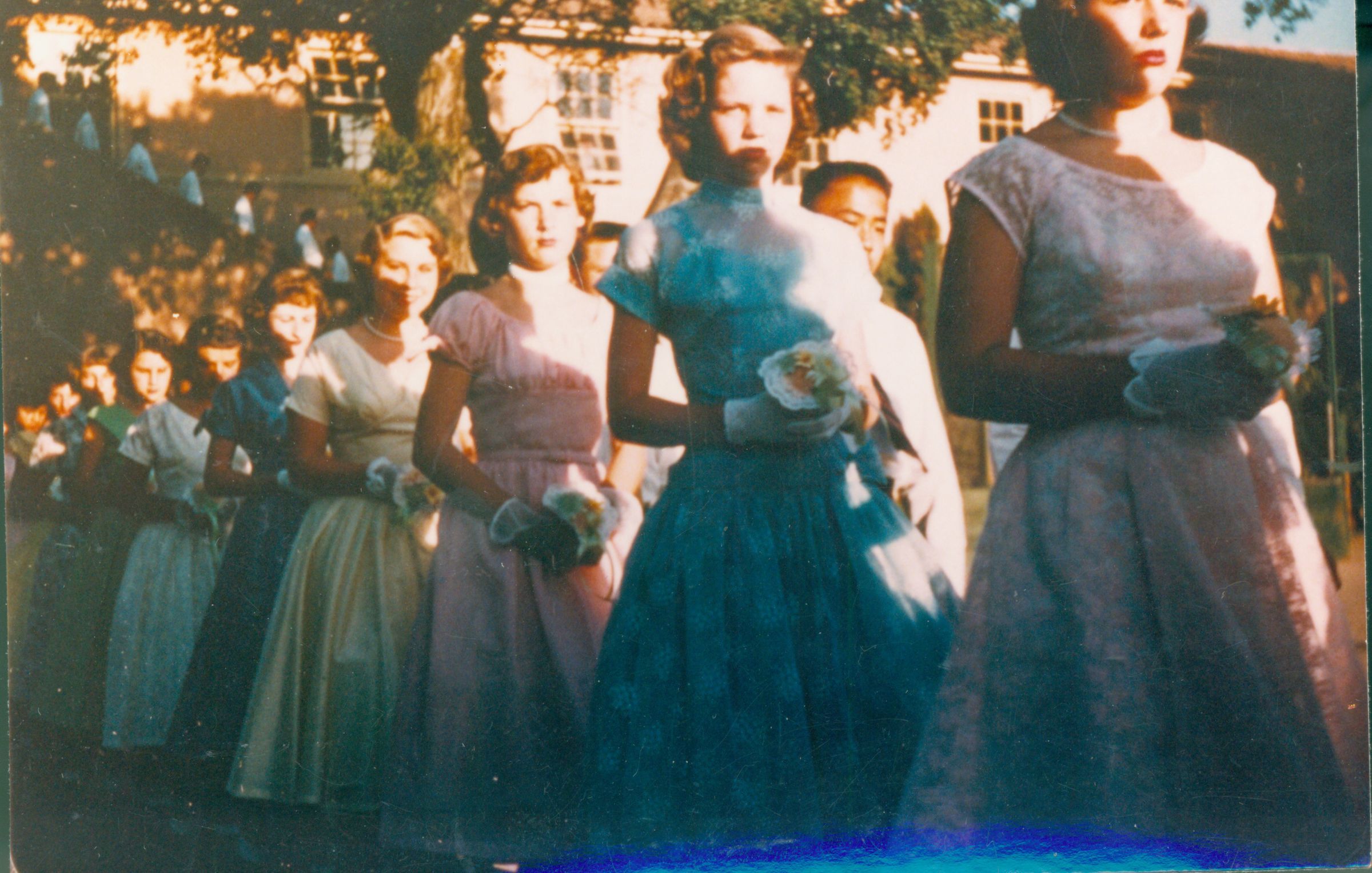 In perfect 1955 style, the girls graduating from the eight grade at University Avenue school wore pastel summer dresses with full skirts, white gloves, and each carried a posy. Some wore pearls. Marsha Caperton is second from right. CAP014Collection