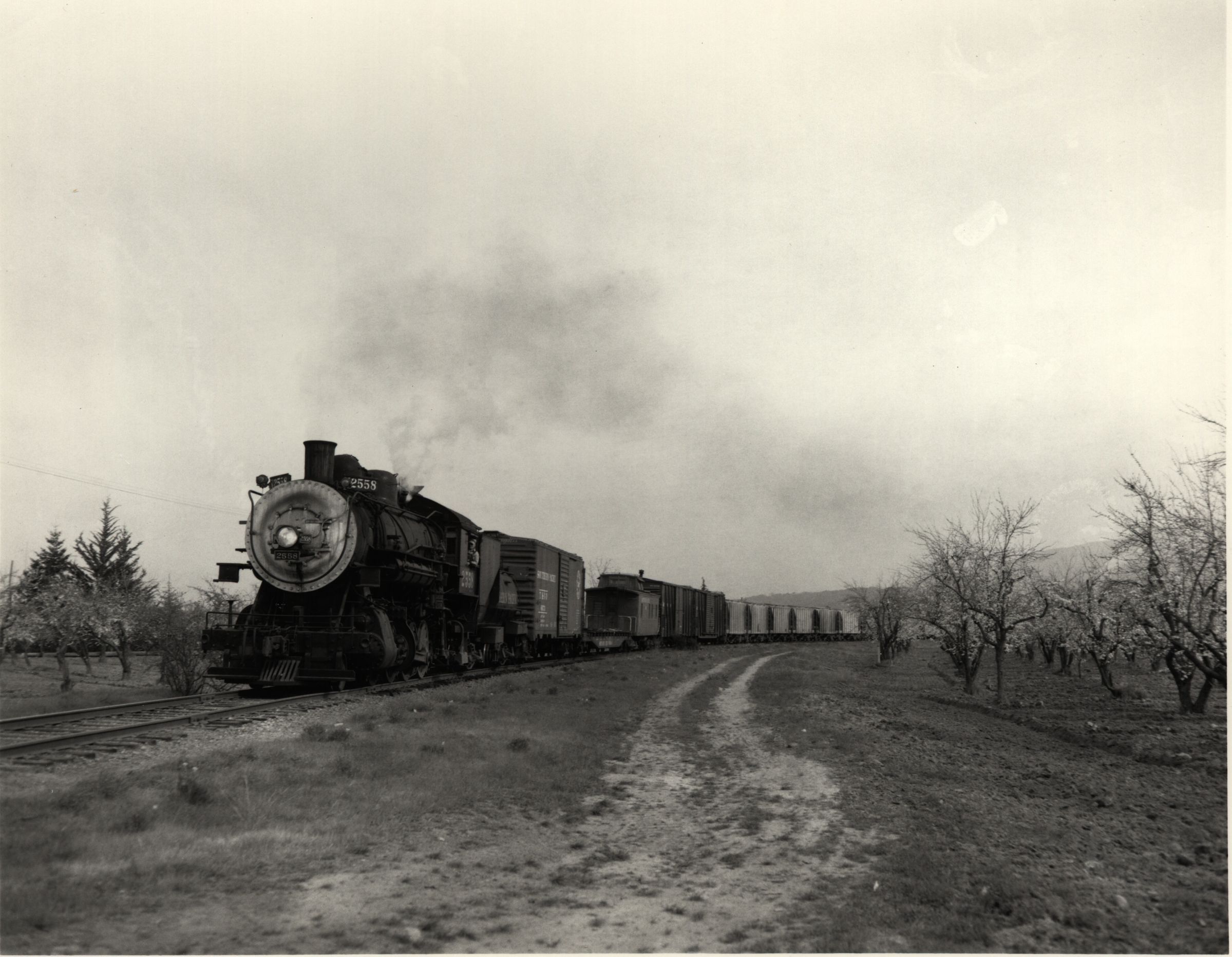 Bound for the cement kilns above Cupertino, the Permanente Local travels past orchards along Wedgewood Avenue on the Mayfield Cut-Off. The local, typically based from San Jose's Newhall Yard, would follow the cut-off to Simla Junction near Monta Vista, where it would split onto Kaiser Cement Corporation's privately owned 1.7 mile spur. Opened in 1939, the plant remains active. BER070Collection