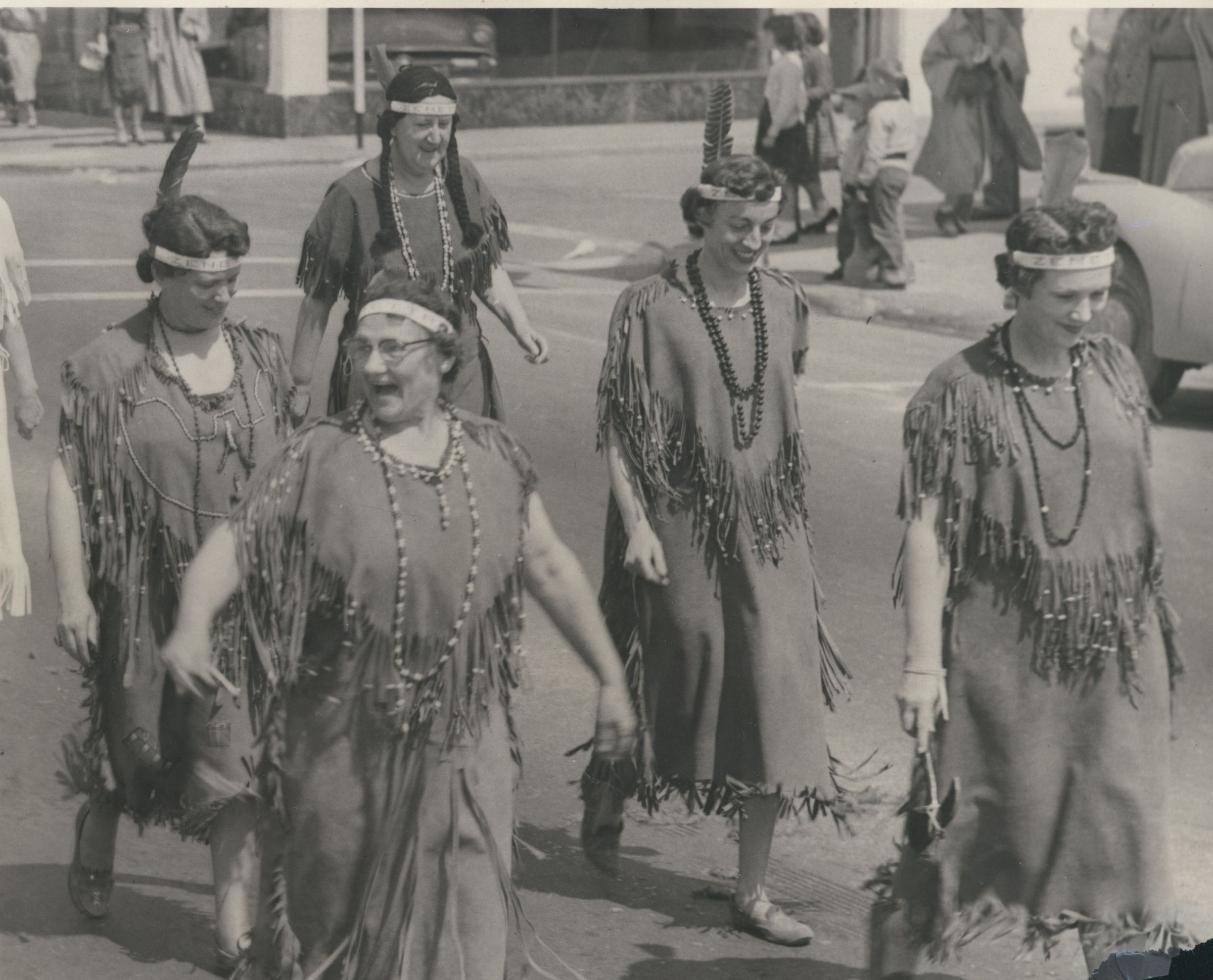 Zenetta Council, No. 158, Degree of Pocahontas, Los Gatos, won the trophy for "Best Adult Marching Group" in the 1957 parade. The Degree of Pocahontas was organized in Los Gatos on June 30, 1916. Their male counterparts were called the "Improved Order of Red Men." Shown here marching in the parade are, clockwise from lower left, Daisy White, Lena Barbieri Conley, Ruby White, Inez Means, and Pearl Hoehn. PAR031Collection
