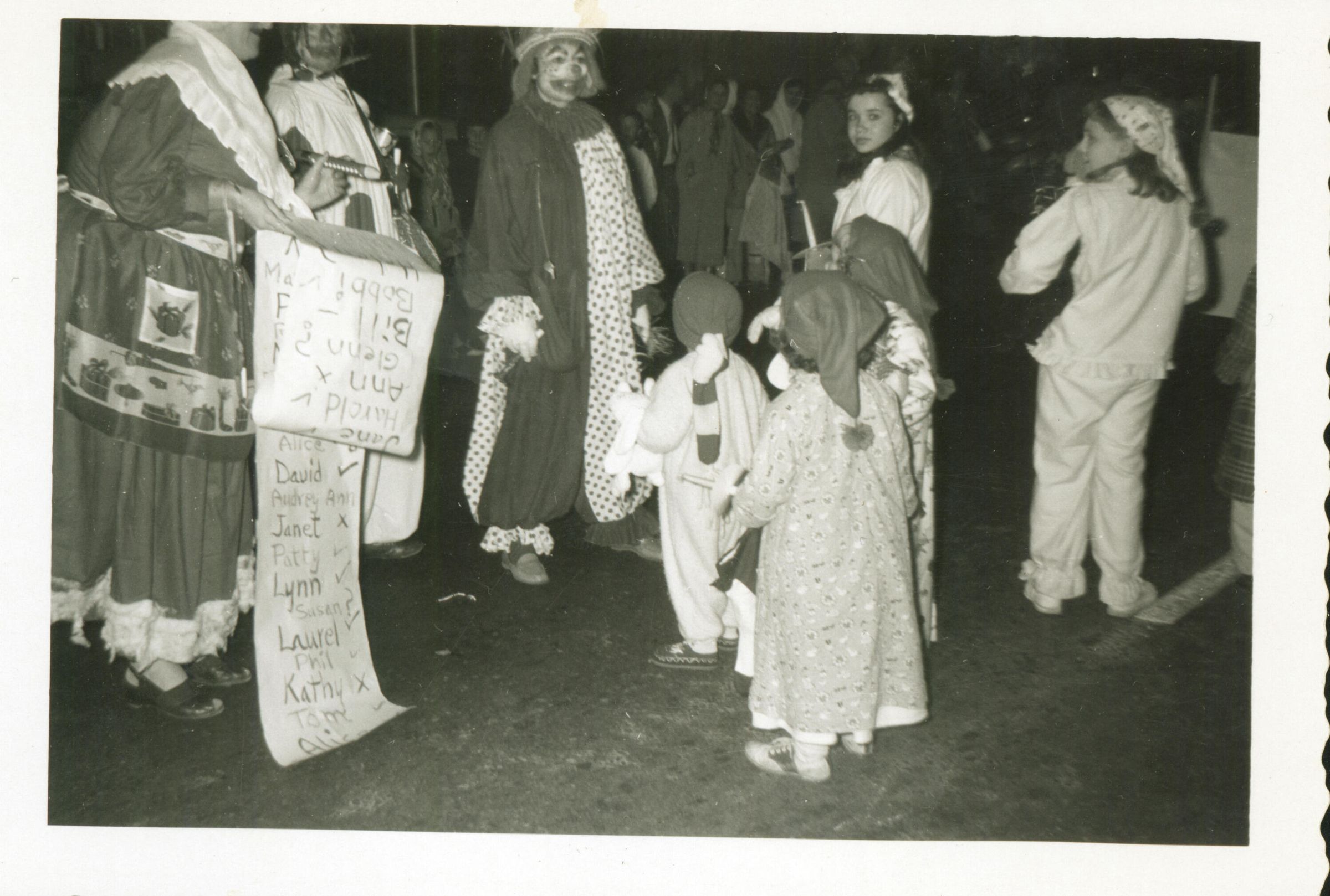 Santa with his list and several clowns at the Christmas parade December 5, 1958. SHU180aCollection