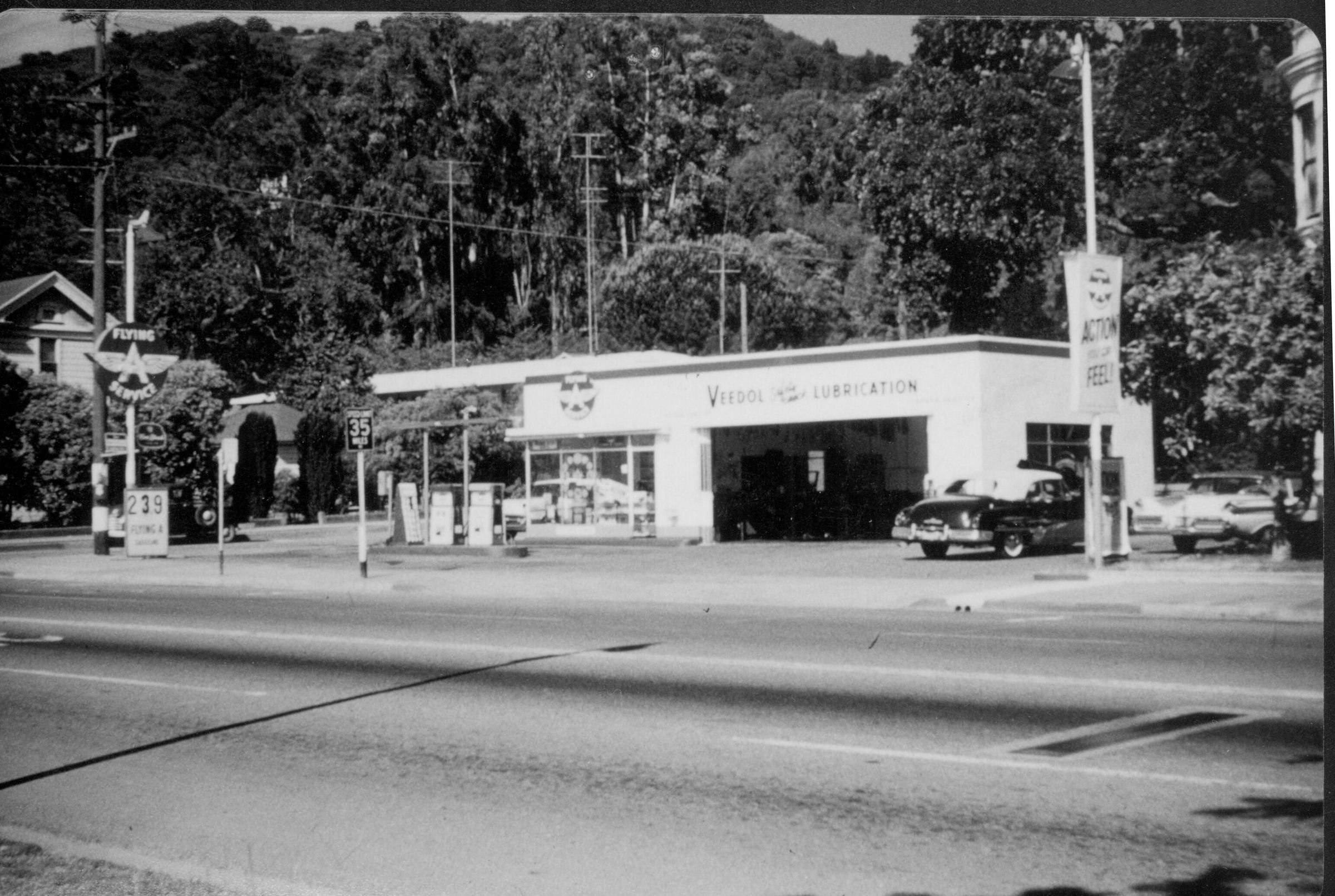 Service station next to the Lyndon Hotel on South Santa Cruz Ave and Broadway. This business opened in the 1950s. BA150Collection