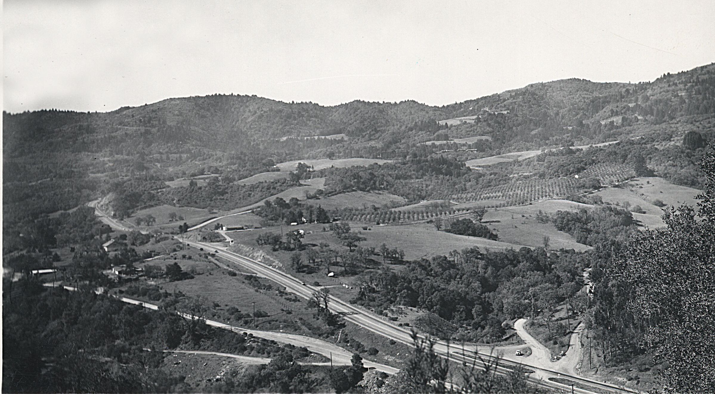 This view is from the south end of Lexington Reservoir approaching Big Moody Curve. It shows both Highway 17 and the Old Santa Cruz Highway. The old highway is to the lower left. A017Collection