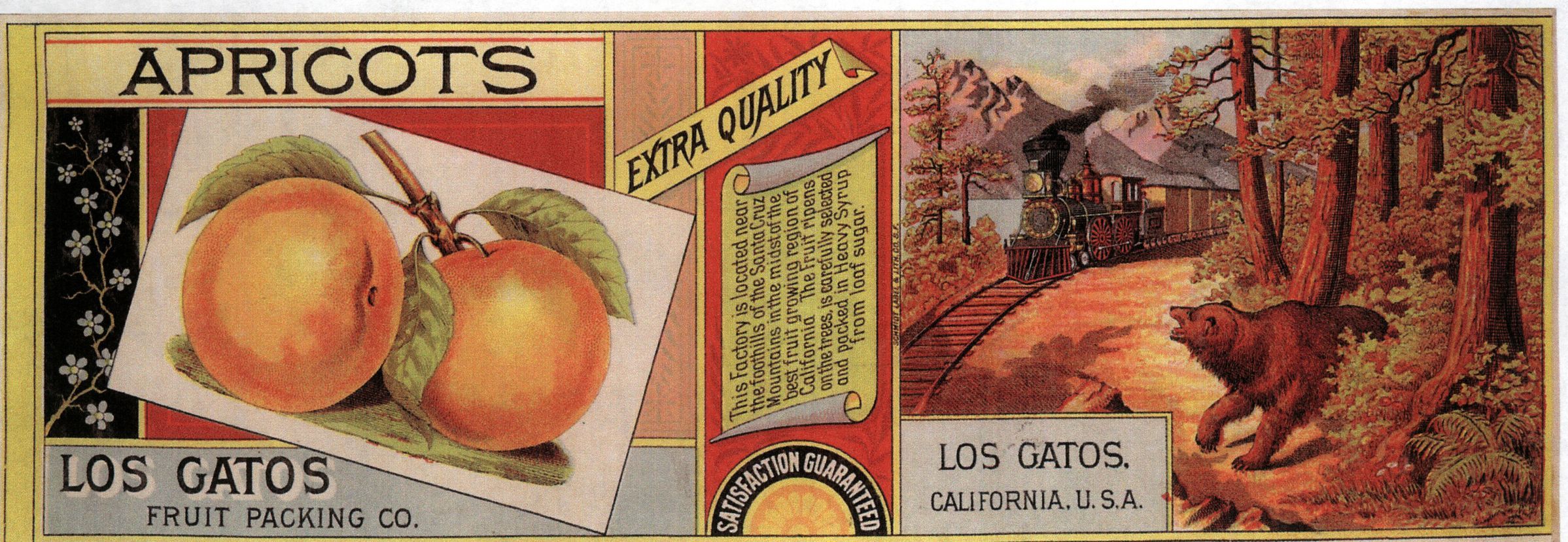 This label from the Los Gatos Fruit Packing Company has splendid graphics representing the town - a bear, a train, the mountains and apricots. AG036Collection