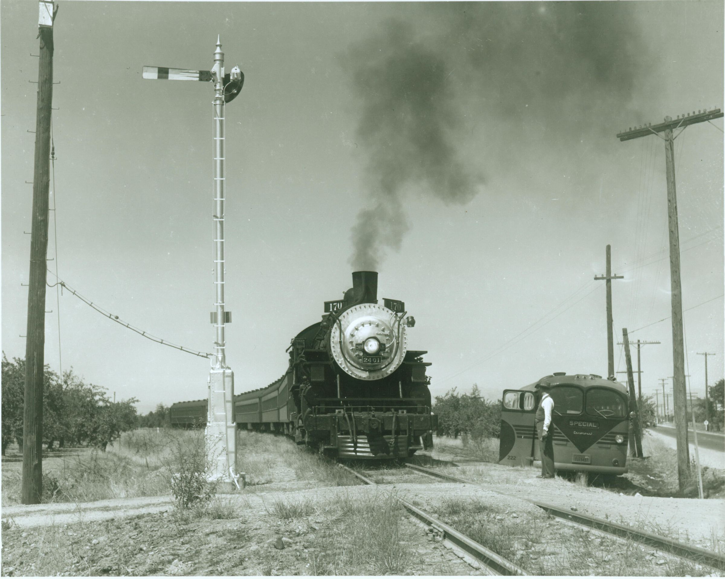 This train is steaming past a semaphore. CHS018Collection