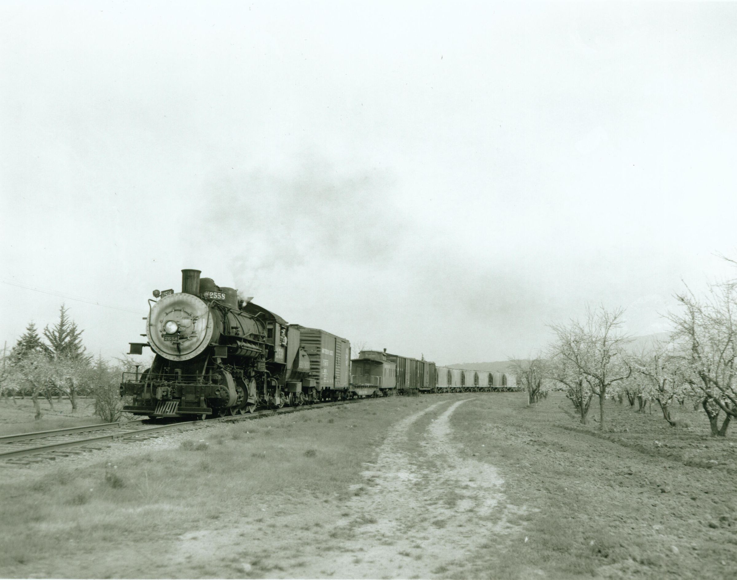 Bound for the cement kilns above Cupertino, the Permanente Local drifts past orchards along Wedgewood Avenue on the Mayfield Cut-Off. The local, typically based from San Jose's Newhall Yard, would follow the cut-off to Simla Junction near Monta Vista where it would split onto Kaiser Cement Corporation's privately owned, 1.7 mile spur. Opened in 1939, the plant remains active today, justifying Union Pacific's continued operation of the Permanente Local. CHS006Collection