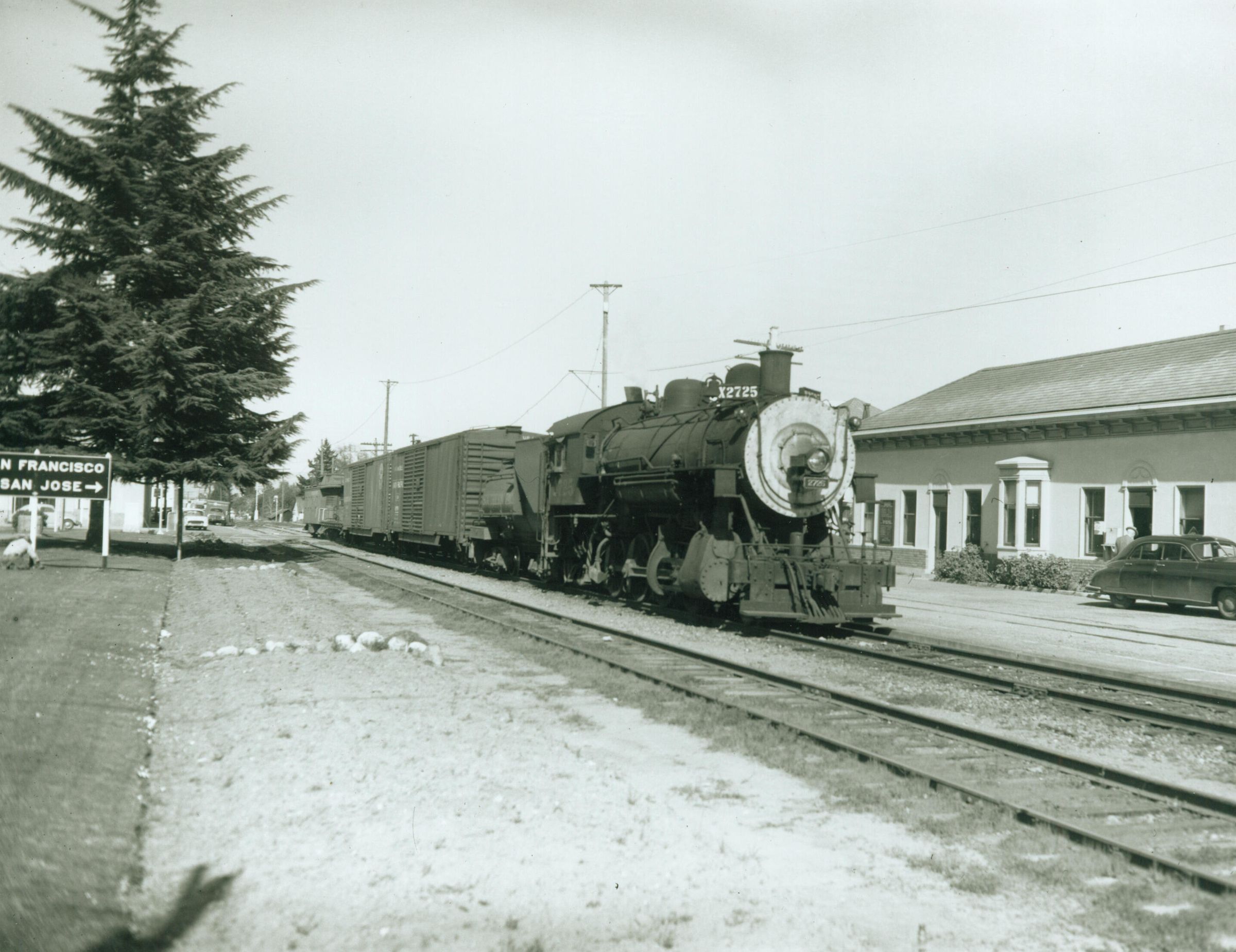 A clear view of Los Gatos station, with the Town's Christmas tree seen at left. CHS010Collection
