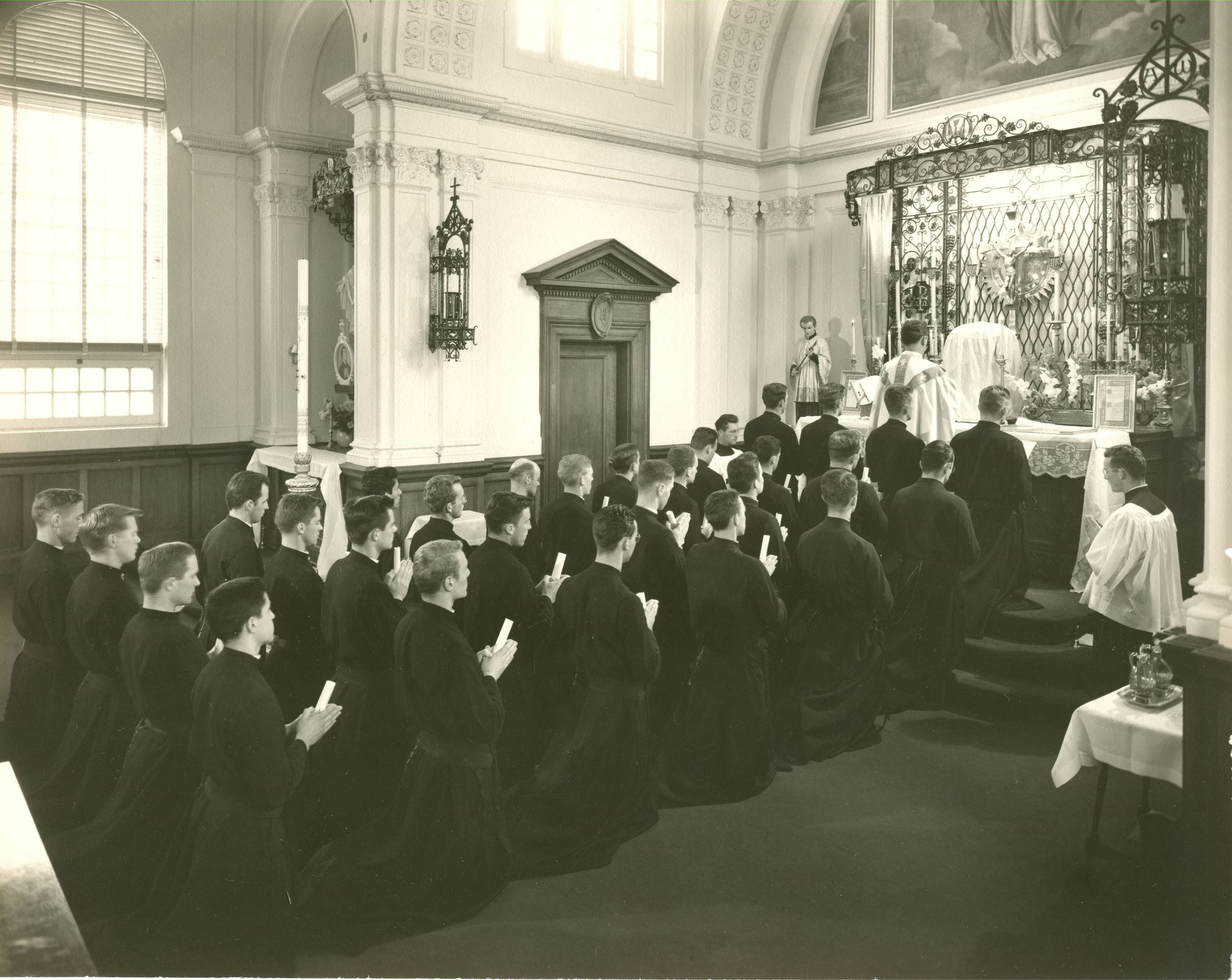 Photograph of staged Vow Ceremony in May, 1950. Vovents had taken their vows between August 15 and October 15, 1949. Celebrant: Fr. John F. X. Connolly; Acolytes: Thomas Conn and Leo Hombach. Row 1 (nearest the altar, left to right): James Gill, John Morris, Richard Coz, George Carroll. Row 2 (left to right): Walter Lees, Samuel Tattu, Thomas Hanrahan, Robert Arrowsmith. Row 3 (left to right): Angelo Musante, Arthur Connolly, Robert Welch, Norman Walling. Row 4 (left to right): Robert Braus, James Latham, Philip Callaghan, Robert Jay. Row 5 (left to right): Cesar Gonzalez, John Boyle, Robert Mihan, Leo Hyde. Row 6(left to right): Robert McDevitt, Mark McConville, Ernest Bracchi, Terence Koch. Row 7 (left to right): Roger Falge, John Reed, Gerald Lentz, Louis Peinado. The picture was taken to be included in the December issue of the publication "The Western Jesuit" which was in the form of a calendar. This picture was featured as July, 1951. NVC028Collection