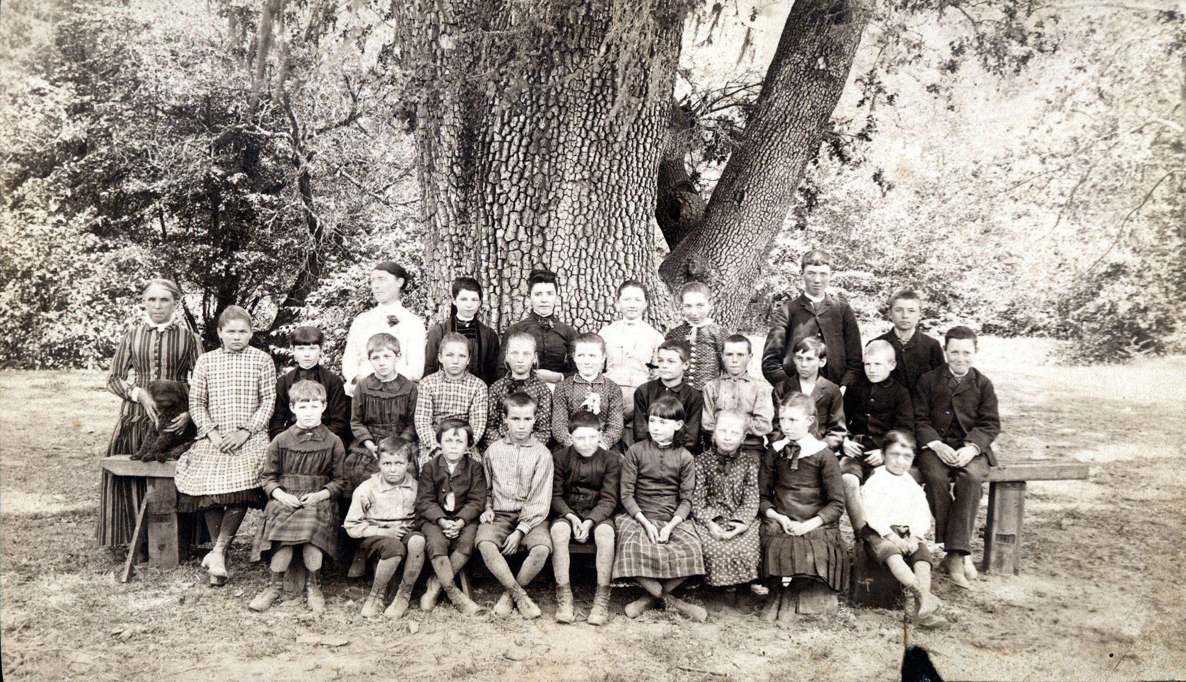Photo of class at Lexington School toward the end of the 19th century. The woman on the far left, probably a teacher, is holding a small, black dog. MTN044Collection