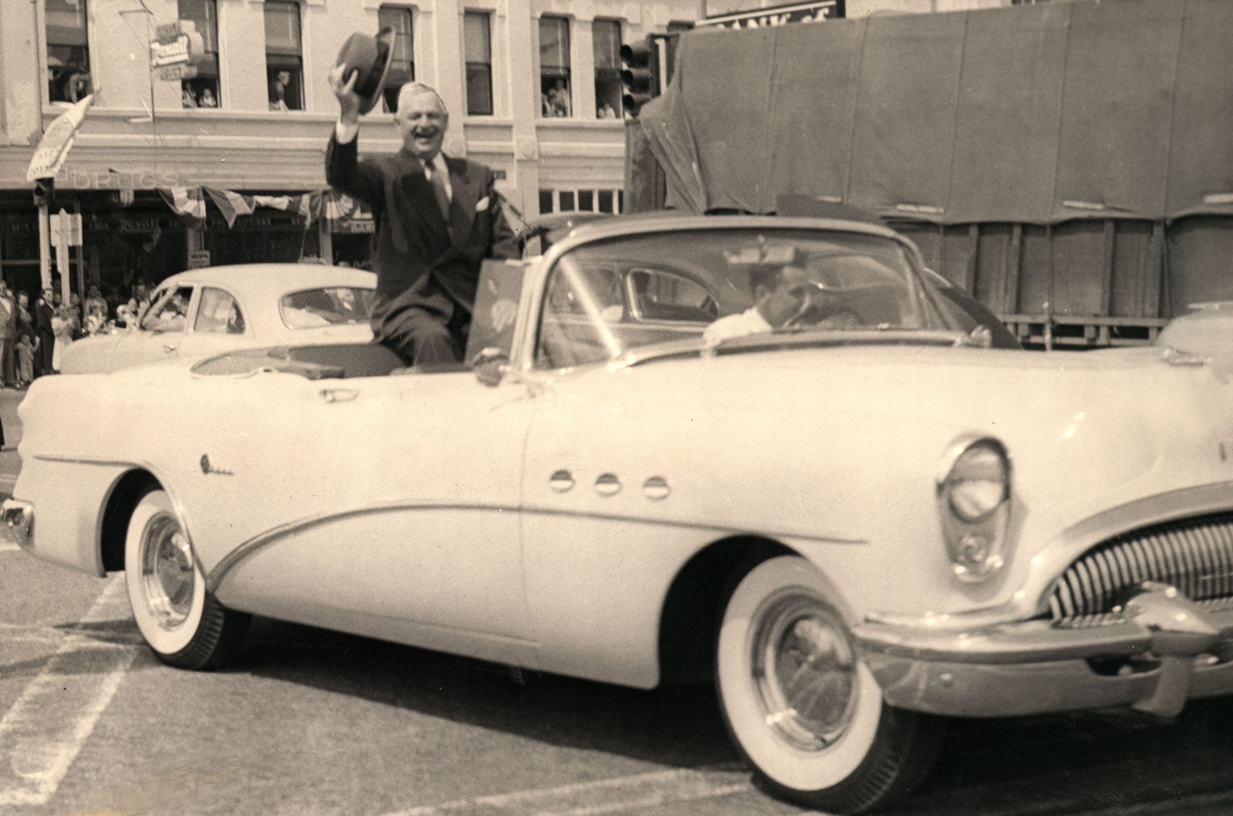 Mayor Charles K. Gamble waves to the crowd during the 1954 Los Gatos Spring Festival parade. PAR021Collection
