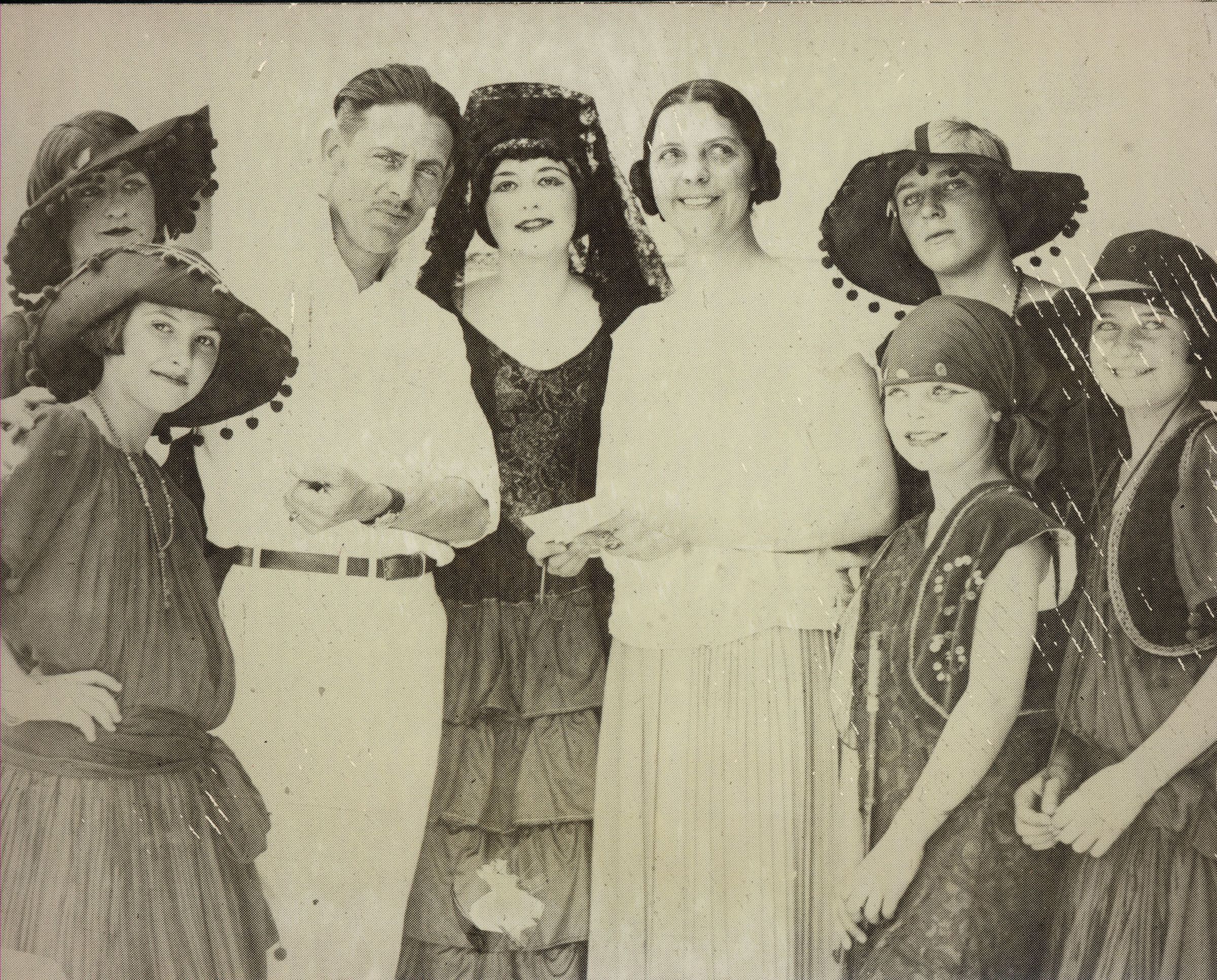 Back row, left to right: Martha Kerswin, Wilbur Hall, Patty Hostetter, Ruth Hall, unidentified. Front row: unidentified, Phyllis Cole, unidentified. Wilbur Hall was the author of El Gato de Los Gatos. The performances were given on June 20 and 21, 1924. PAG036Collection