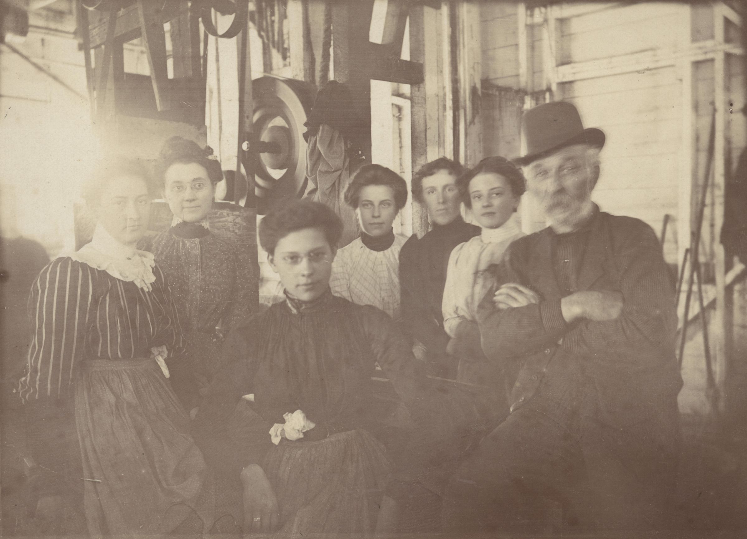 The Los Gatos Canning Company was established in 1882 at 57 North Santa Cruz Avenue, where the movie theater is currently located. The company was purchased by George Hooke in 1894. This photograph is from that time period, and George Hooke is pictured at right. AG020Collection