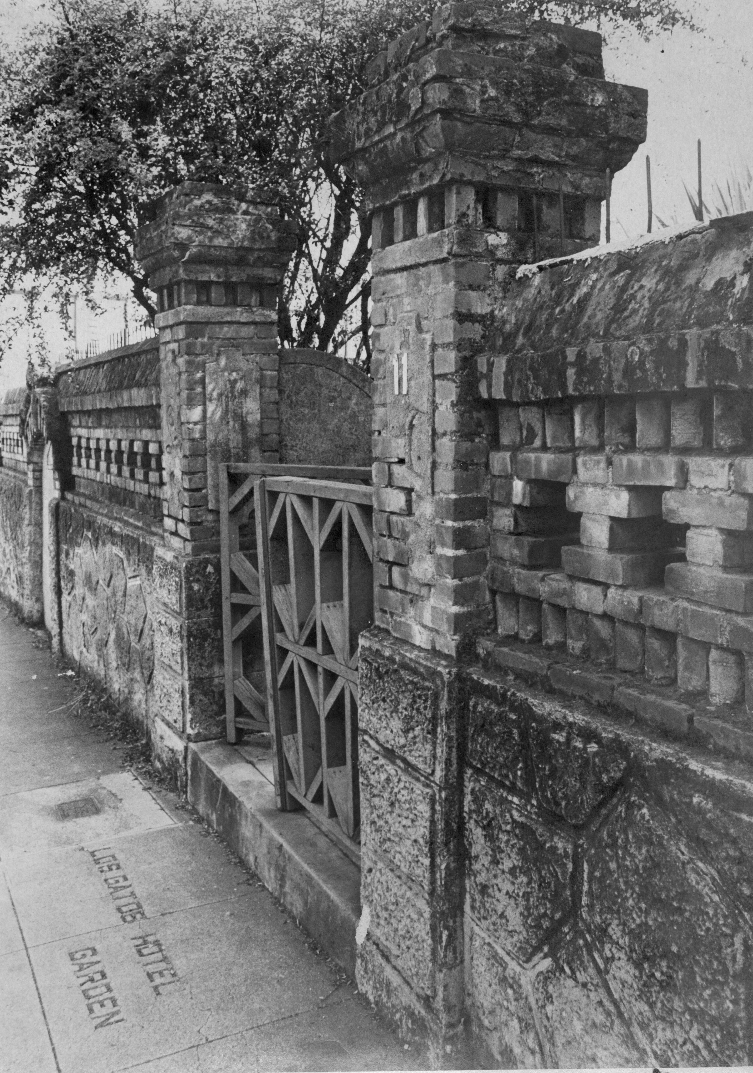This brick wall is all that remains of the Los Gatos Hotel, which burned in 1968. Luigi Mariotti, who bought the hotel in 1904, commissioned an Italian stonemason to build the wall in 1910. BA124Collection