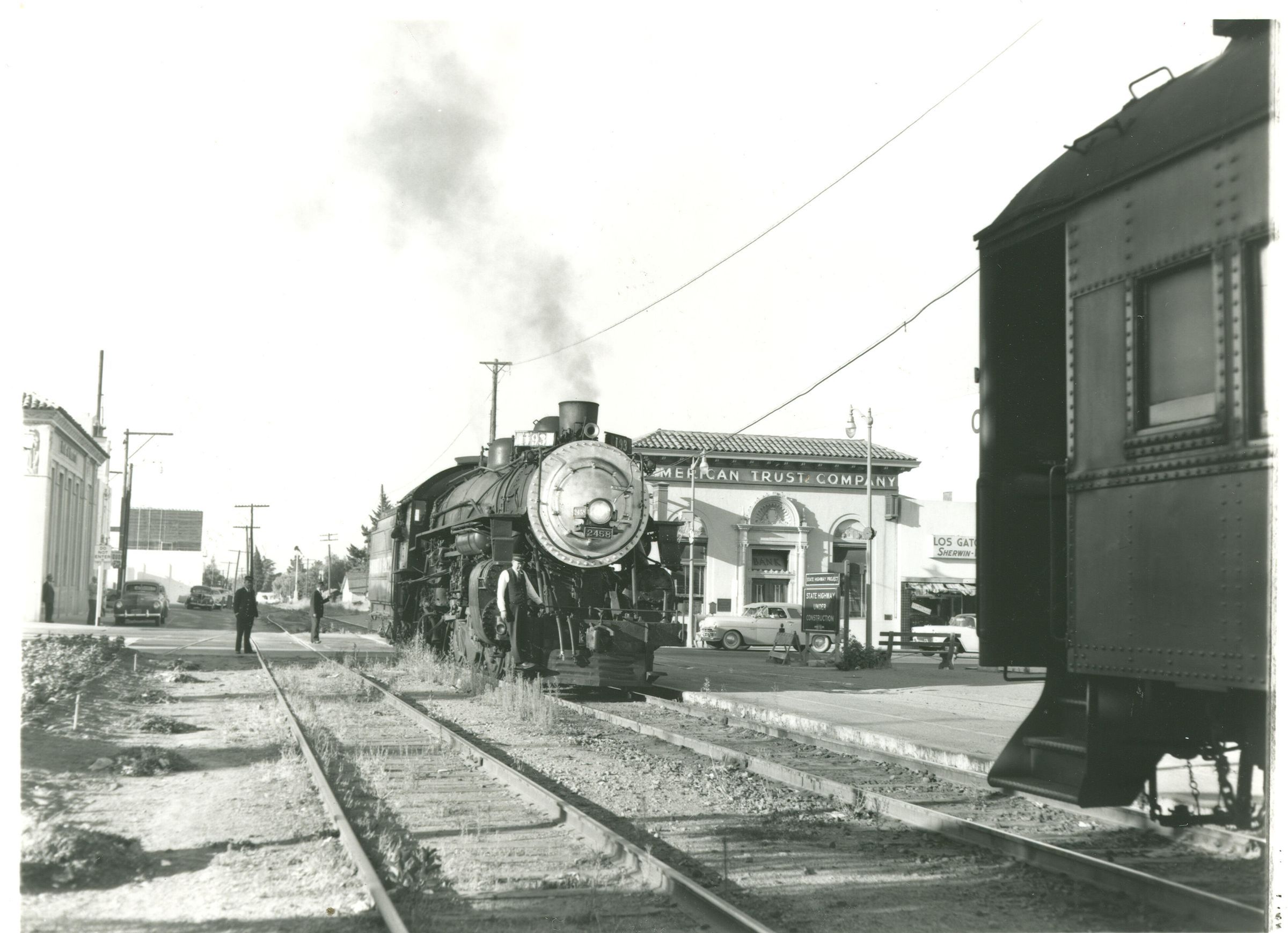 "Del Monte" regular #2458 engine runs around her train after bringing the evening commute from San Francisco. The engine, built by the American Locomotive Company (ALCO)'s Brooks Works, was retired in 1955 and used in stationary boiler service at Calexico, CA until the early 1960s. BA104Collection
