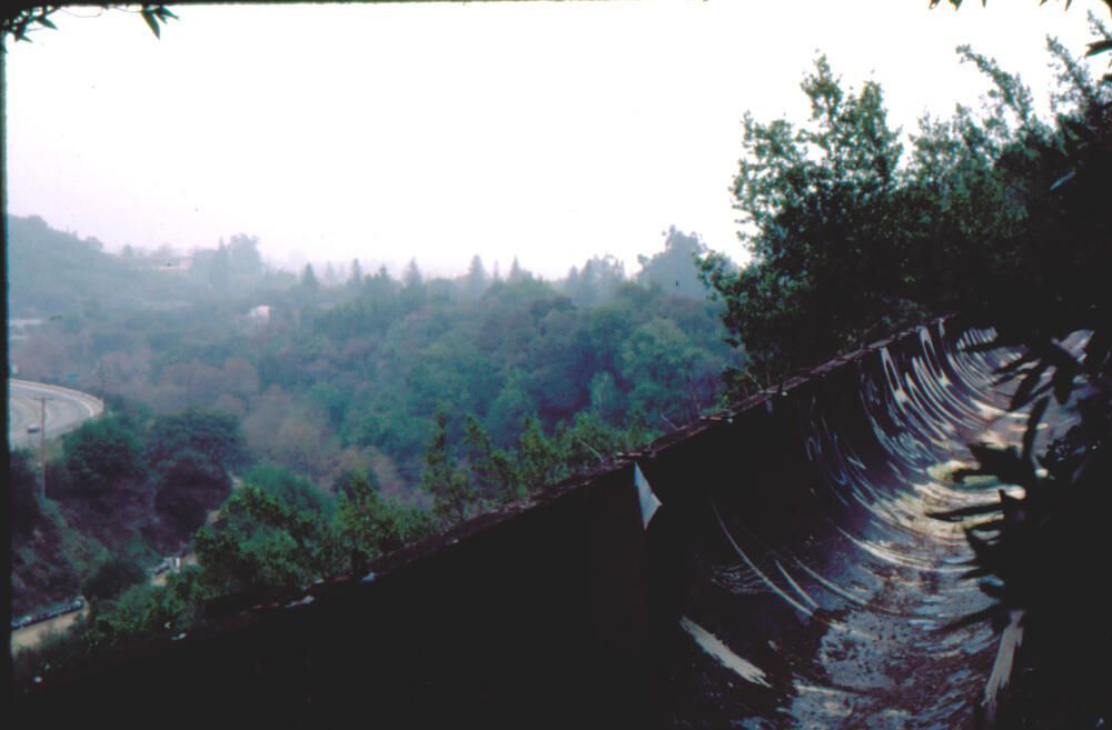 In 1871, San Jose Water Company built a wooden flume along the east bank of Cats' Canyon in order to pick up water at Jones Dam above Alma and bring it to Los Gatos. Reconstructed in 1880, the flume provided a romantic walkway for lovers, although this practice was somewhat dangerous and was discouraged by Water Company officials. Encounters with wild cats and skunks were not infrequent. The three-mile long wooden flume was replaced by a galvanized steel aqueduct in 1935. BAK001Collection