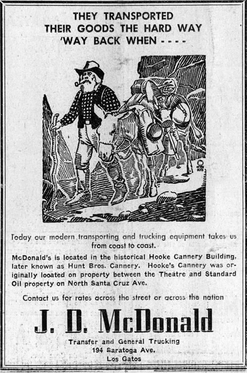 Advertisement gives the location for the J. D. McDonald Company, transfer and general trucking, as the old Hunt Brothers Cannery site. AD011Collection