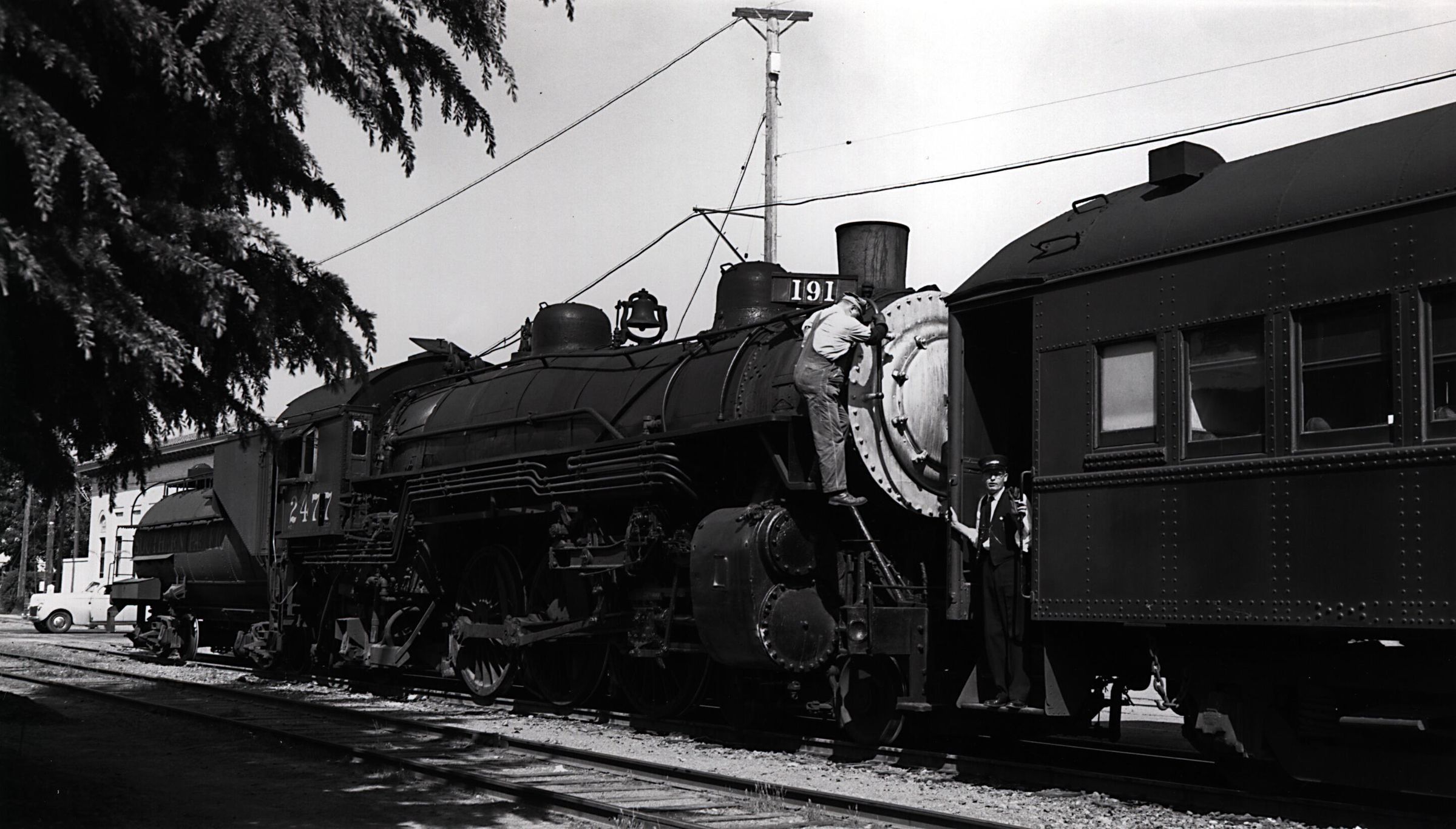 In this photo taken at the Los Gatos depot, the conductor looks at the cameraman while the engineer descends from the locomotive. The number assigned to the Saturday afternoon deadhead was 191. BER080Collection