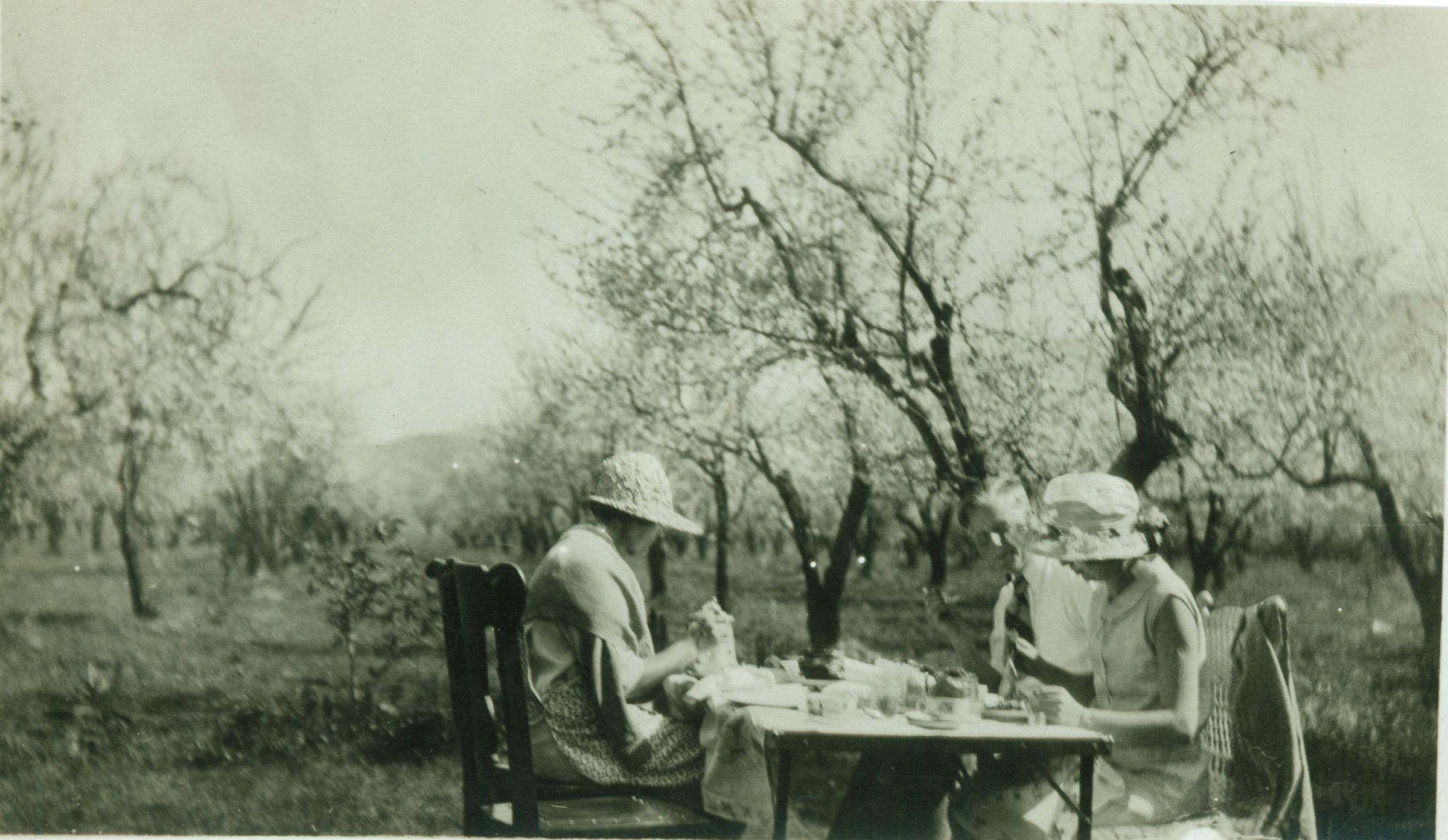 This photograph nearly has the feeling of an impressionist painting. Members of the Bergtold family are enjoying tea in their orchard. BER197Collection