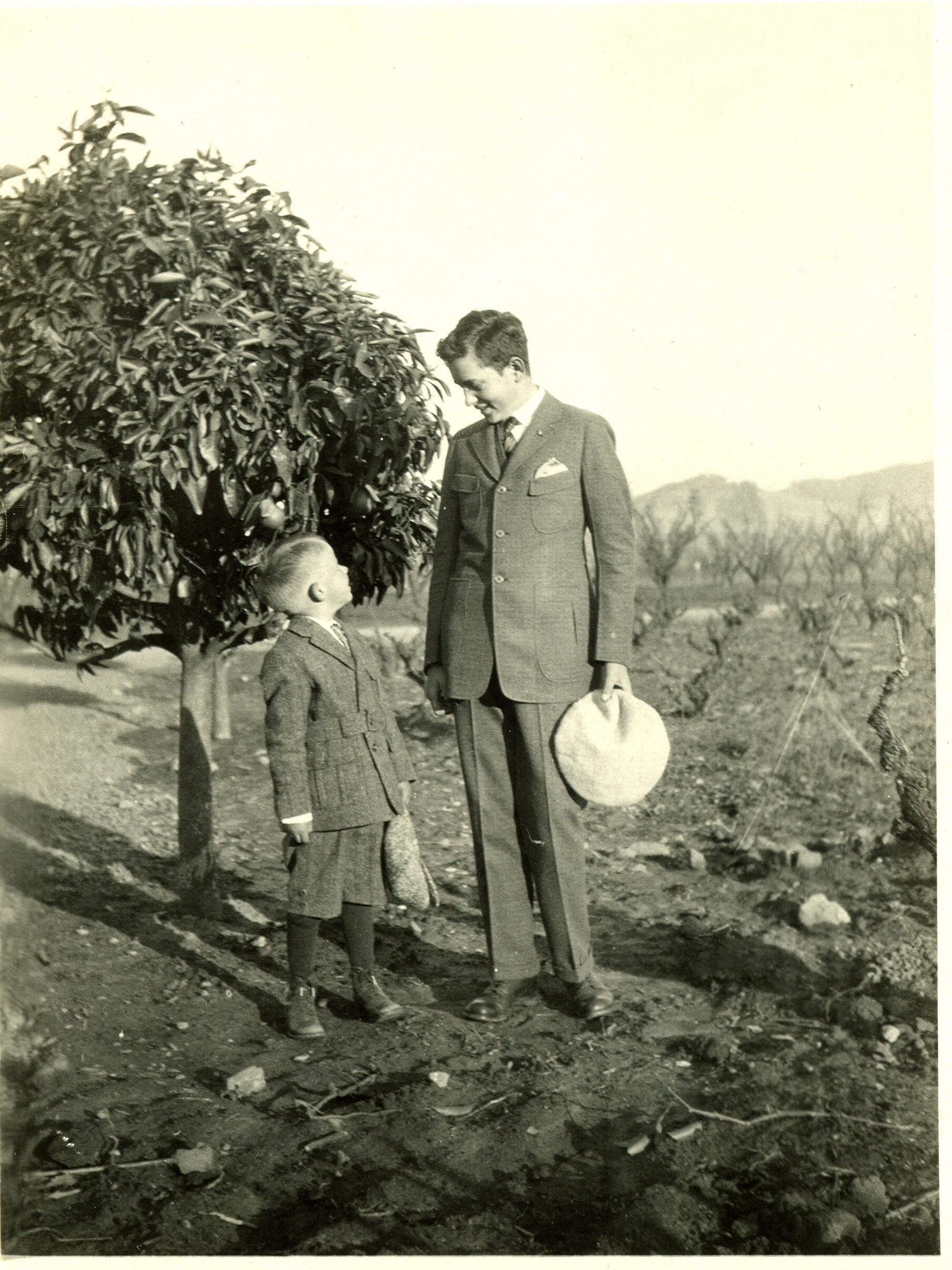 Frank Knowles, Jr., left, son of Dr. Frank W. Knowles (1858-1936) with his neighbor Fred Bergtold. The Knowleses were neighbors of the Bergtolds at Placer Oaks Ranch. Dr.Knowles had one of the original mill stones from Forbes Mill hauled by mule along the bank of Los Gatos Creek to his residence on San Jose Avenue, where it was embedded in the back porch landing. Lyman Bergtold, Fred's younger brother, removed the stone from the landing after the Knowles home was moved to another location, courtesy of new owners Ted Reed and Jerry Graham, and took it to his residence, where it remained until it was donated by the Bergtold family to the Forbes Mill Museum. bgf003Collection