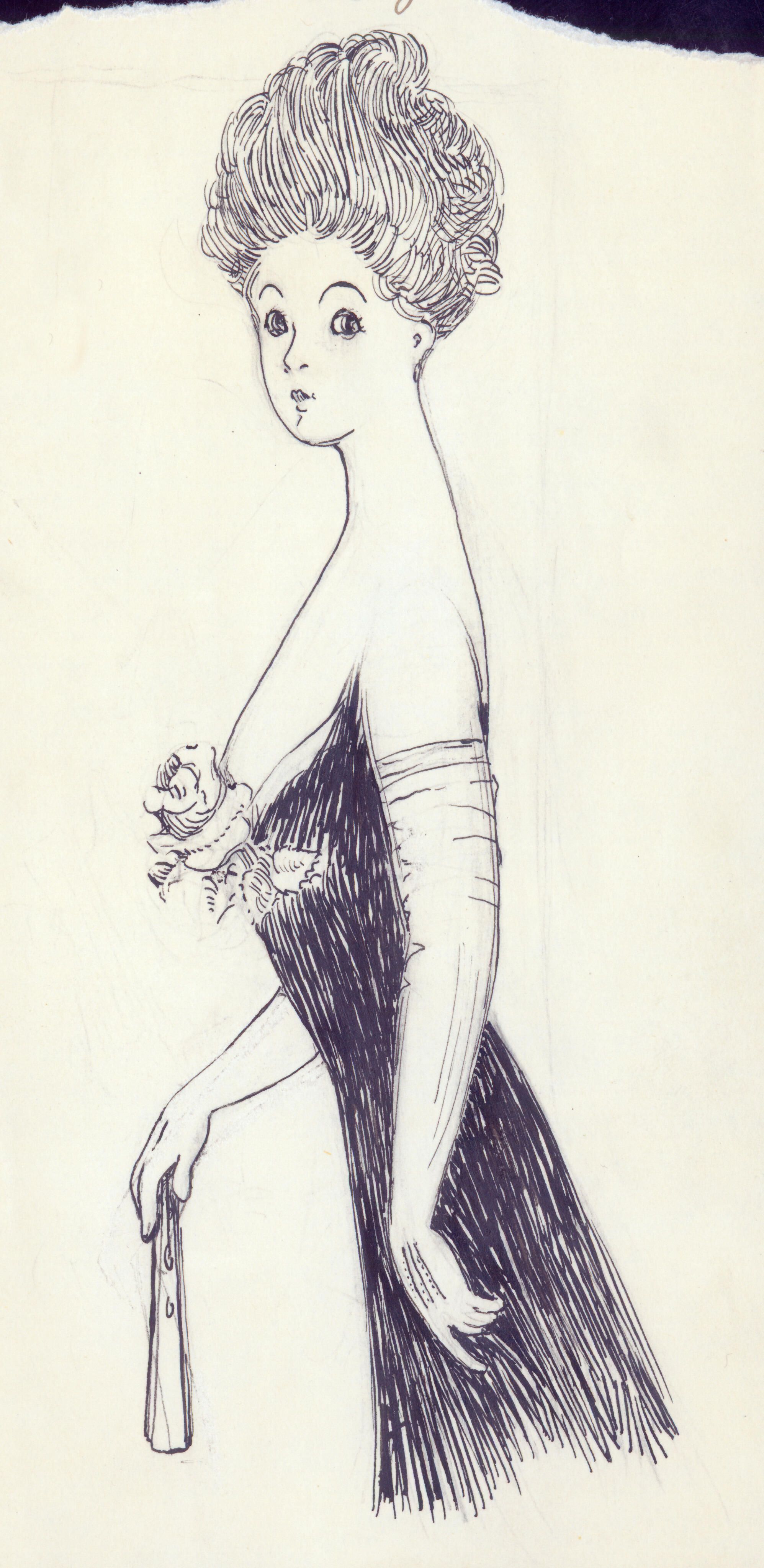 Janet A. Tobin (1879-1946), a noted artist, drew this pen-and-ink image of a woman in a low-cut ball gown, a classic early nineteenth century style. It was said that a refined woman always looked as if she were on her way to a garden party. A translucent, soft complexion and a delicate waist were the most valued measures of beauty, no matter the health risks. Wavy hair, loosely piled on top of the head, was made popular by the "Gibson girl" model of the era. Janet's older sister Helen, (1869-1955), penned a poem to go along with her sibling's drawing. Janet and Helen, along with their sister Mary (1876-1960), lived out their lives at 128 East Main Street in Los Gatos. TOB021Collection