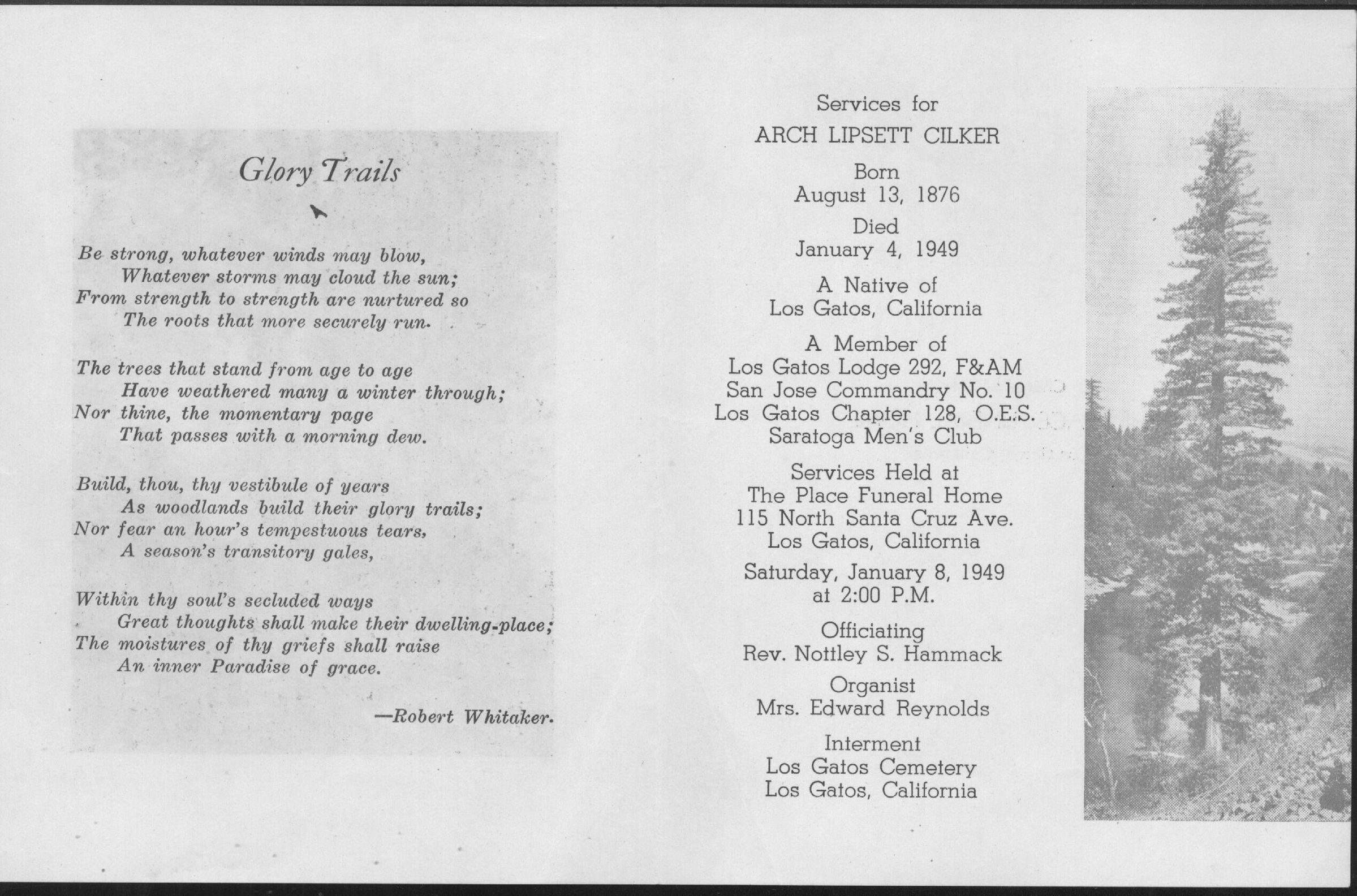 Program of funeral service for Arch Lipsett Cilker at 2 o'clock p.m. on January 8, 1949, at the Place Funeral Home, Los Gatos. CLK011bCollection
