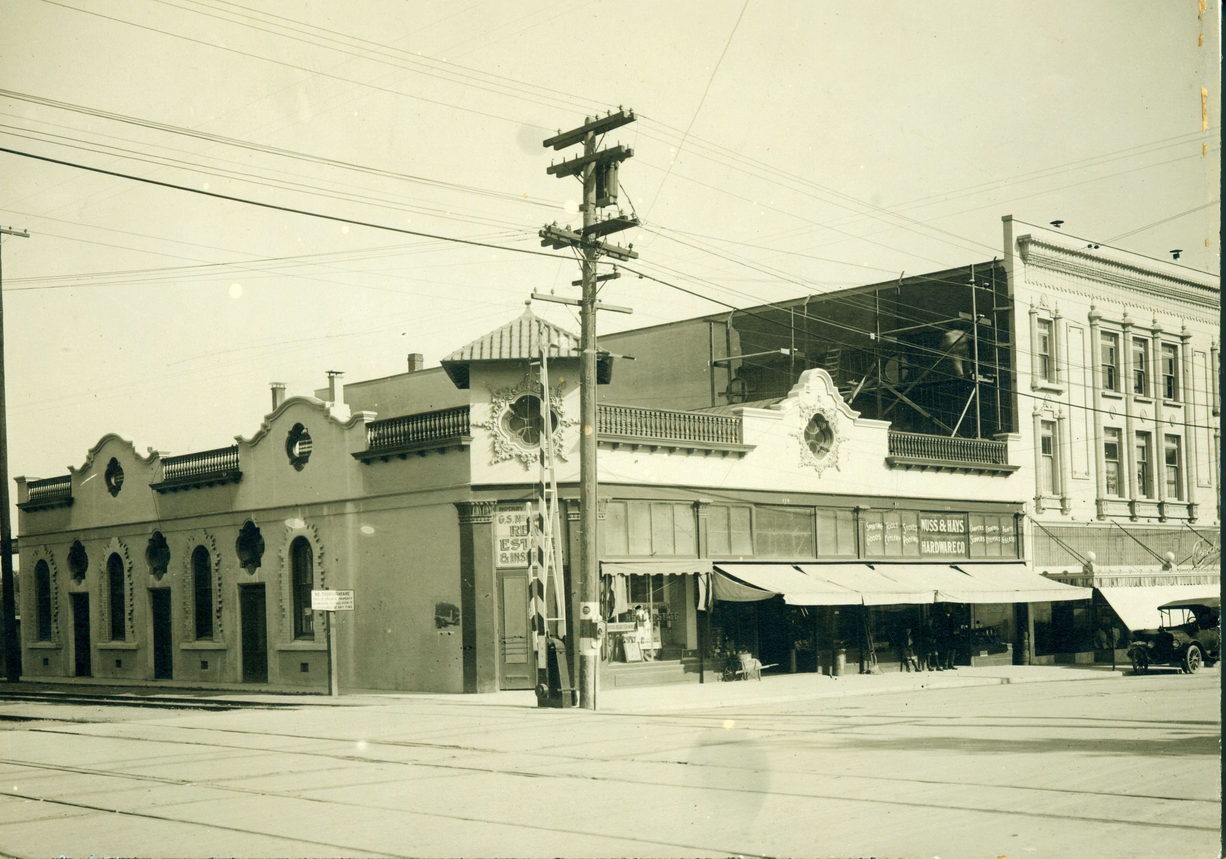 Corner view of a real estate office and Nuss & Hays Hardware. The year is probably 1916, as scaffolding is in place where the new logo for "Criders Department Store" will be painted on what had been the Opera House. BDG080Collection