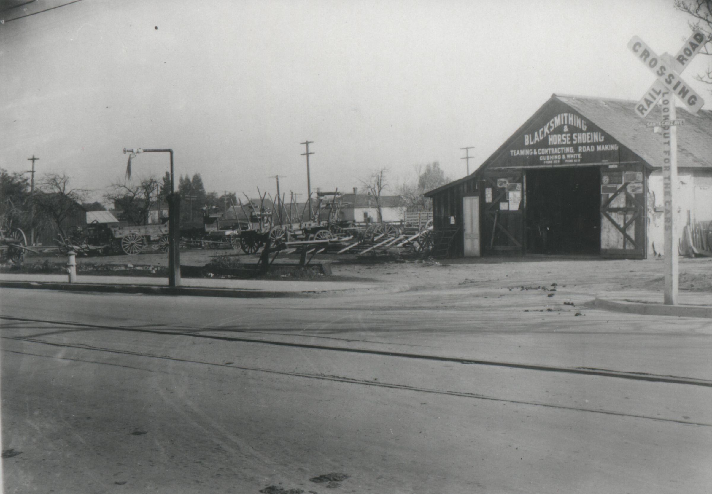 Frank Allen Cushing in 1921 was the owner of a blacksmith shop in Los Gatos, having arrived in town in 1904. The sign on the railroad crossing says Santa Cruz Ave., and Cushing owned a residence at 120 Santa Cruz Ave., so presumably the smithworks was nearby. BDG084Collection