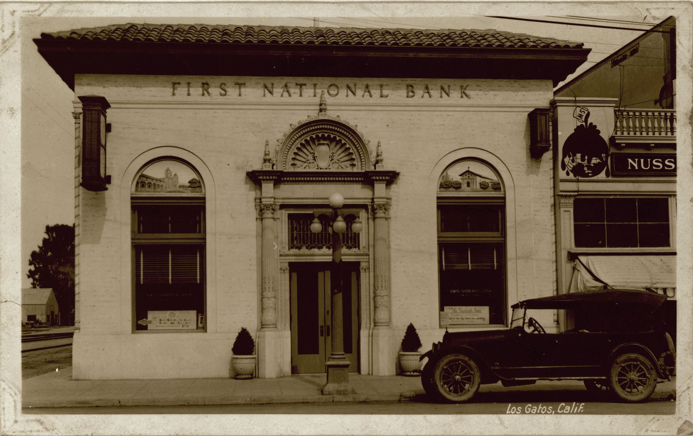 First National Bank, the third bank in Los Gatos, was organized in 1911. This Renaissance Revival building at 160 West Main Street was built in 1920 and served as a bank until 1955. In 1927, Clarence Hamsher was elected president of the bank. At the far left, the Southern Pacific right-of-way occupies land now dedicated to parking. Since the closure of the bank, the building has housed a number of restaurants. BDG013Collection