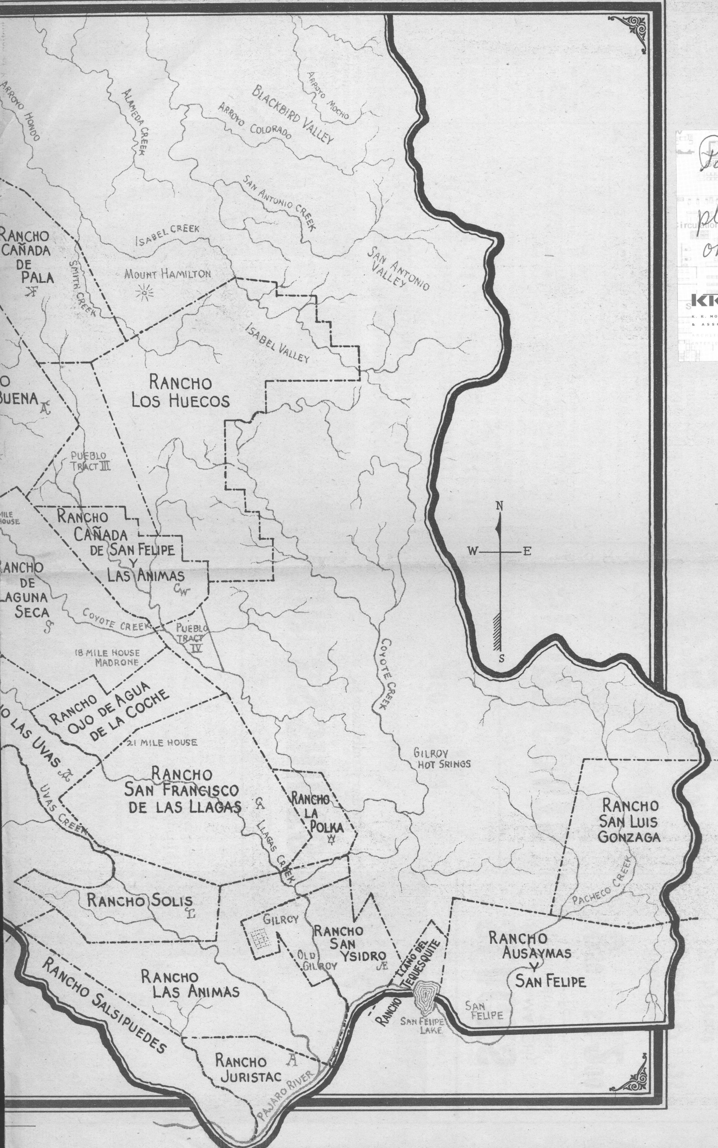 A delineation of Spanish-Mexican Government land grants or ranchos and pueblo sites in early Santa Clara Valley. Historian - Clyde Arbuckle. Cartographer - Ralph Rambo. MPS002a